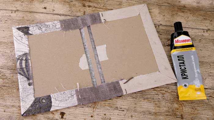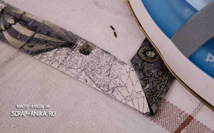 Заутюживаю сторону и два оставшихся угла. По периметру к обложке приклеиваю ткань клеем Момент Кристалл.