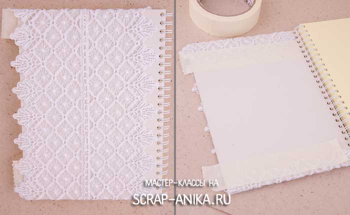 Кружева или гипюр прикладываем к обложке, на внутренней стороне закрепляем малярной лентой.
