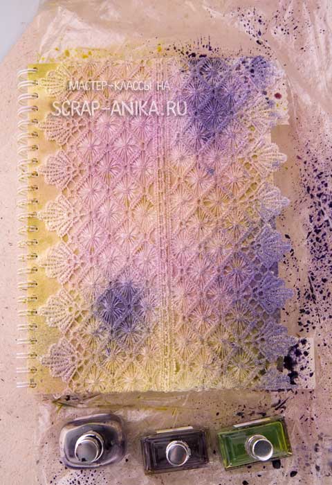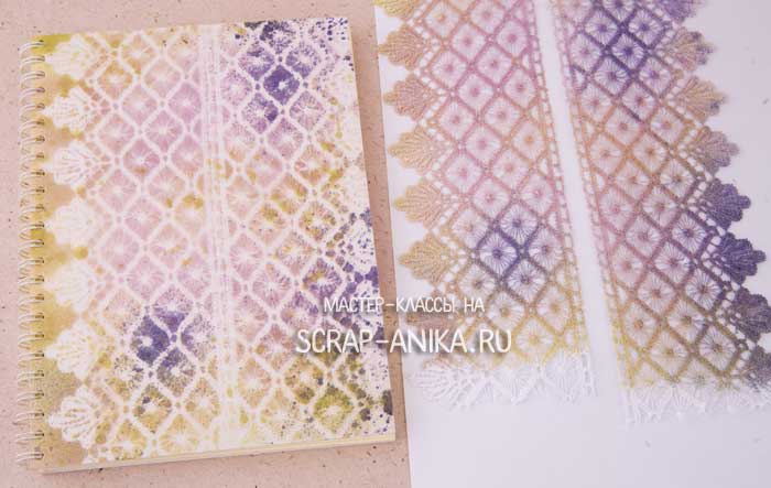 Блокнот готов. По желанию можно украсить оборот обложки (я просто побрызгала теми же чернилами, но уже без кружева.