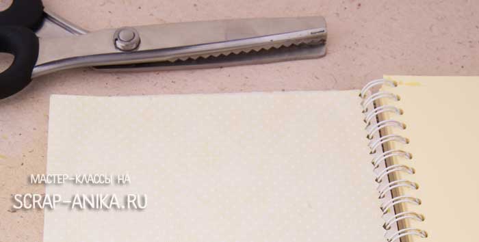 Пока сохнет обложка, ножницами "зиг-заг" срезаем край бумаги для форзаца. Этот край мы вклеим как можно ближе к пружине.