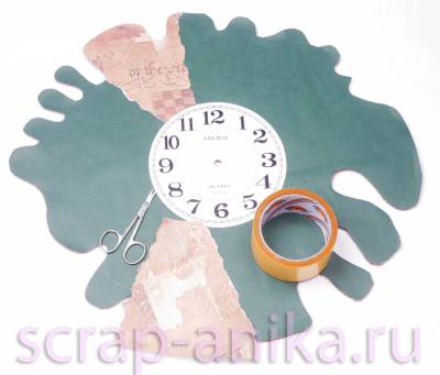 вырезаем по контуру наши будущие часы. Делаем по центру отверстие. ВНИМАНИЕ! Отцентрируйте часы! Я для этого вставила шило в отверстие и прислонила к стене основу. Если основа не переворачивается, то Вы сделали всё правильно. Очень часто делают эту ошибку - не центрируют часы. А потом они на стене начинают переворачиваться и падать. Приклеила на основу зелёную бумагу (двойным скотчем или клеем - кому как удобно). Циферблат я не делала - поставила тот, который был с готовых часов. Еще взяла с готовых часов механизм и стрелки.