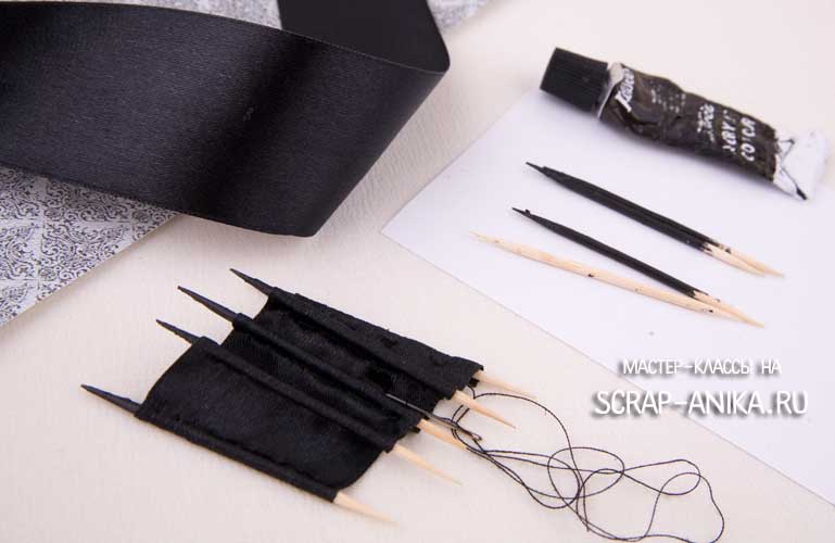 Еще я решила сделать такой декоративный элемент, как крылышко летучей мыши. Для этого мне понадобилось несколько зубочисток, атласная лента 4 см шириной и черная акриловая краска. Зубочистки покрасила черным акрилом, высушила. Атласную ленту закрепила несколькими стежками за зубочистки, сформировав "крылышко" летучей мышки. Неокрашенные концы зубочисток отрежу при пришивании. Под крылышко подложу нежное кружево № 45.