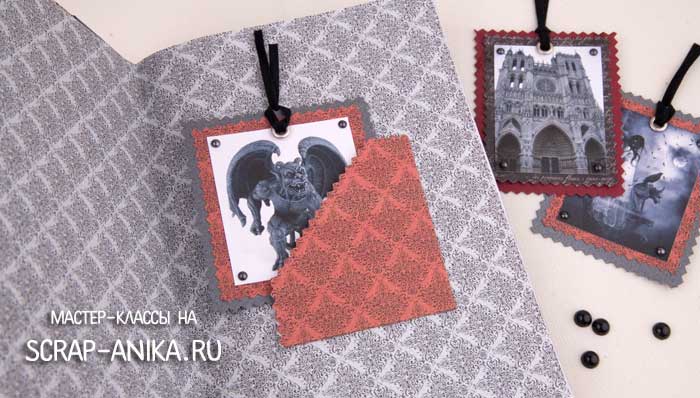 Вторая, вернее, их группа - тэги с понравившимися картинками из интернета. Тоже создают атмосферу готичности. Такие теги можно вставлять в кармашки на форзаце или просто закладывать между страничками. Кстати, картинки стараюсь всегда оформлять в рамочку - основном картоне и бумаге из одной коллекции с форзацами. Пробила люверс и вставила замшевый шнур. Металлические стразы использовала по уголкам (эффект маленьких гвоздиков).