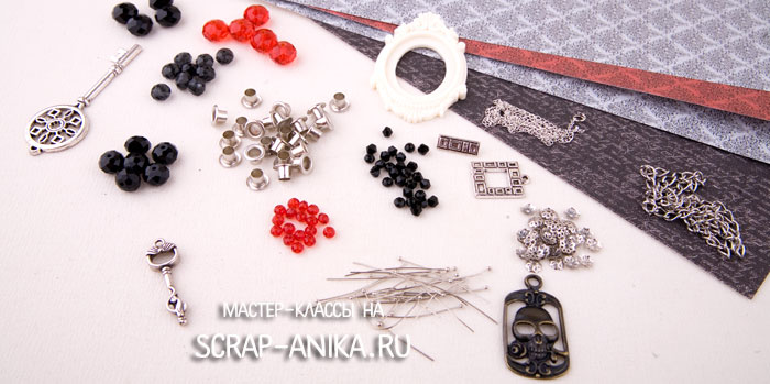 Если честно, я сама еще не знаю сколько и чего я использую в работе. Возможно, что я что-то уберу, а что-то добавлю. Уже сейчас думаю, что ключ, который я выбрала, слишком большой - он может быть центром композиции. Но в этой работе я решила сделать центром рамочку. Поэтому ключ заменю на мелкий. Суть в том, что серебряная фурнитура для готической темы очень актуальна. Соберите всё, что у Вас есть этой тематики, а что используете, будете смотреть по ходу сборки (чувство меры не терять).
