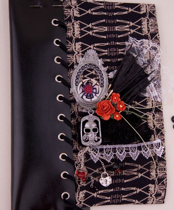 Что интересно, я планировала центром сделать рамку, а самой выделяющимся объектом стала подвеска с черепом. Сначала мне показалось, что они будут конфликтовать друг с другом, но поместив подвеску на черные кружева с розами, я решила эту проблему. Рамочка оказалась на пестром фоне и отдала преимущество подвеске.
