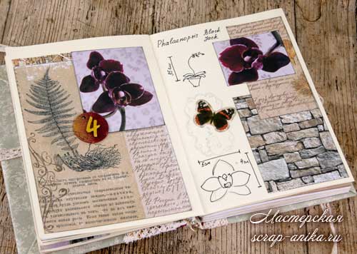 Больше 10 страниц я сделала тогда, поэтому первые страницы больше коллажные, с использованием чипбордов и гербария. Но полюбоваться можно. А сейчас решила его продолжить страничками, более насыщенными техниками.
