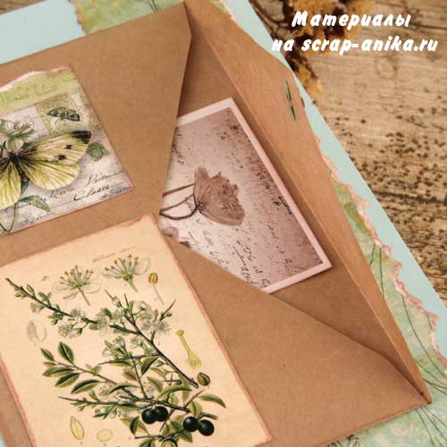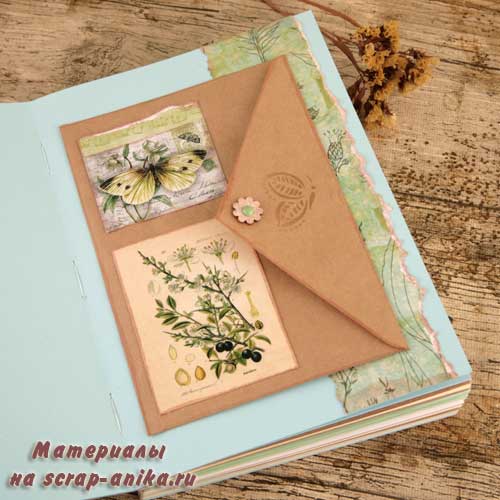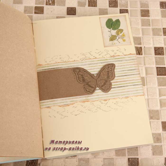 Основа для этой странички - готовый конверт из крафт-бумаги. Сюрприз - карточка с картинкой на ботаническую тему. Украшение клапана - чипборд в виде цветочка и брадс зеленого цвета; кроме того, бабочка, нарисованная через трафарет штемпельными чернилами.