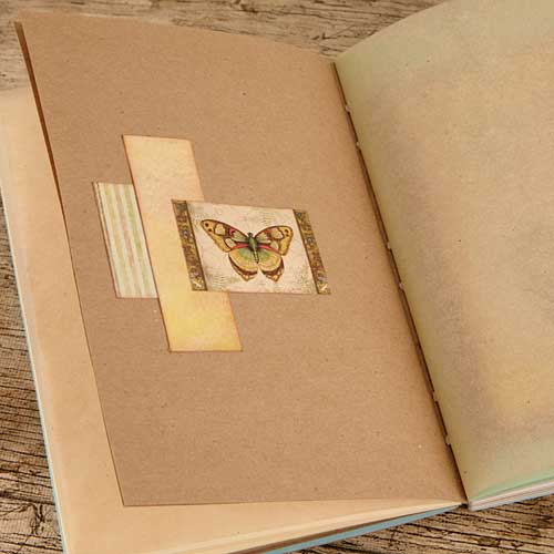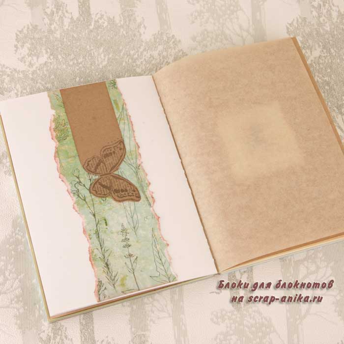 Для основы был выбран блок с разноцветными листами и вставками из крафта и пергамента. Толщина листов 160 г/м.кв. Как альтернативу можно использовать такой же блок из белой бумаги.