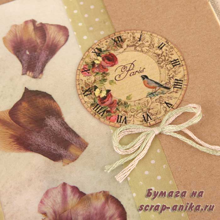 Эта страница снова с гербарием. Лепестки приклеены на фон из акварельной бумаги, закрыты пленкой. Но для ее закрепления на этот раз использованы не брадсы, а скотч с рисунком в горошек. Дополнительный декор - часы и бантик из ниток мулине, которые были использованы для вышивки обложки.