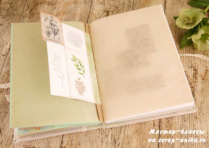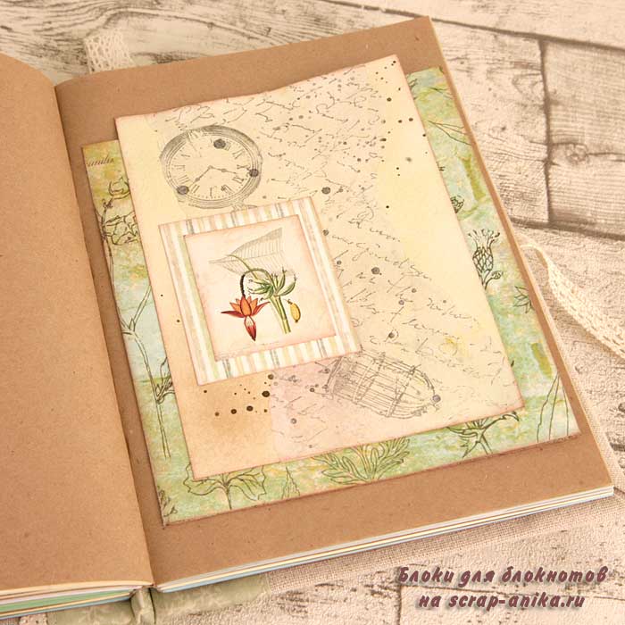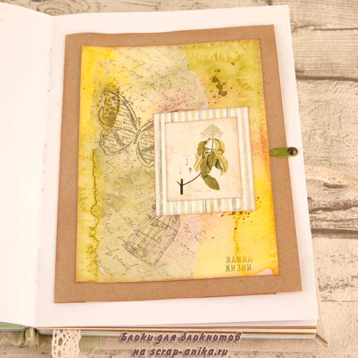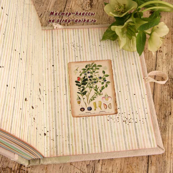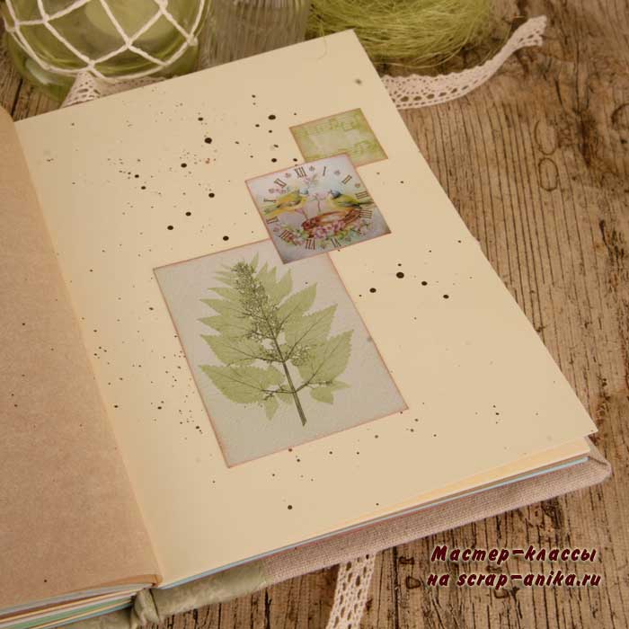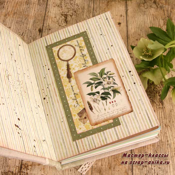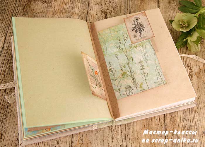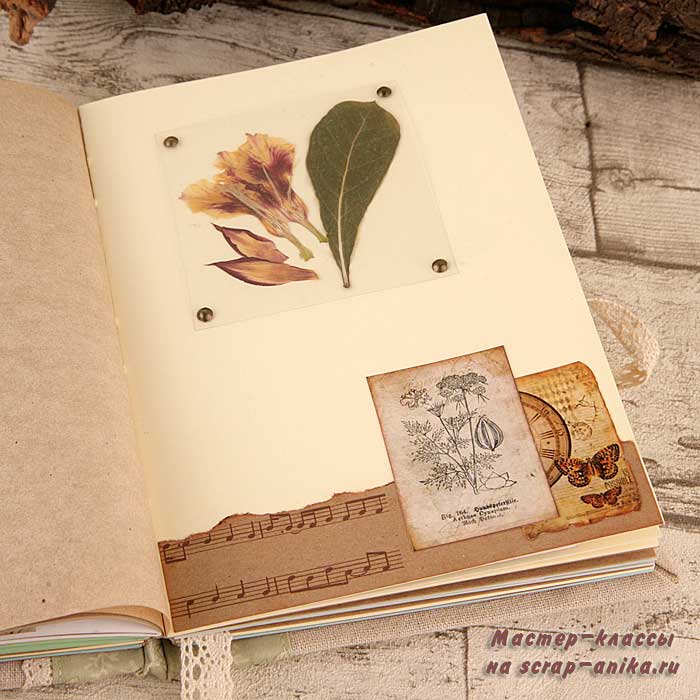 Какой же артбук в ботаническом стиле без гербария? Интересное решение - убрать его под плёнку, а саму плёнку закрепить по углам четырьмя брадсами. И, конечно, небольшой коллаж из красивой бумаги :)