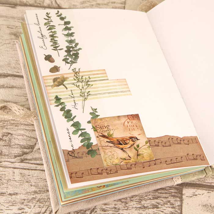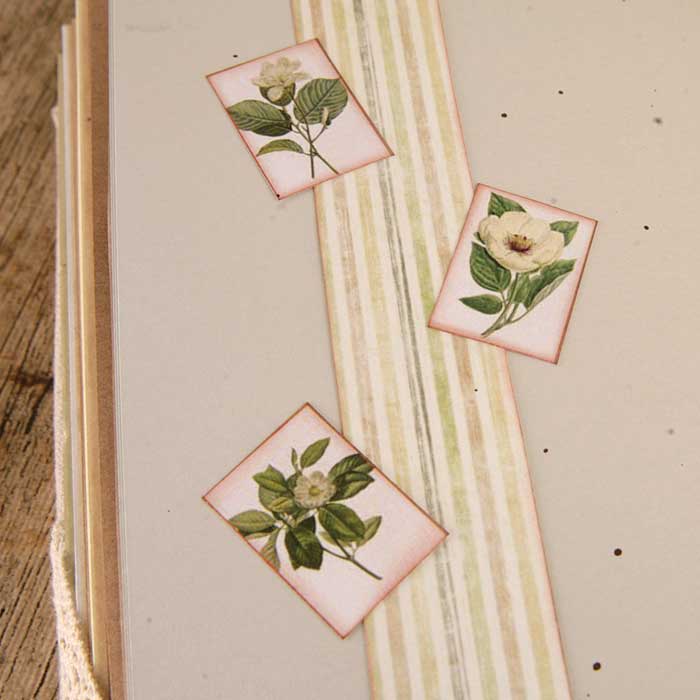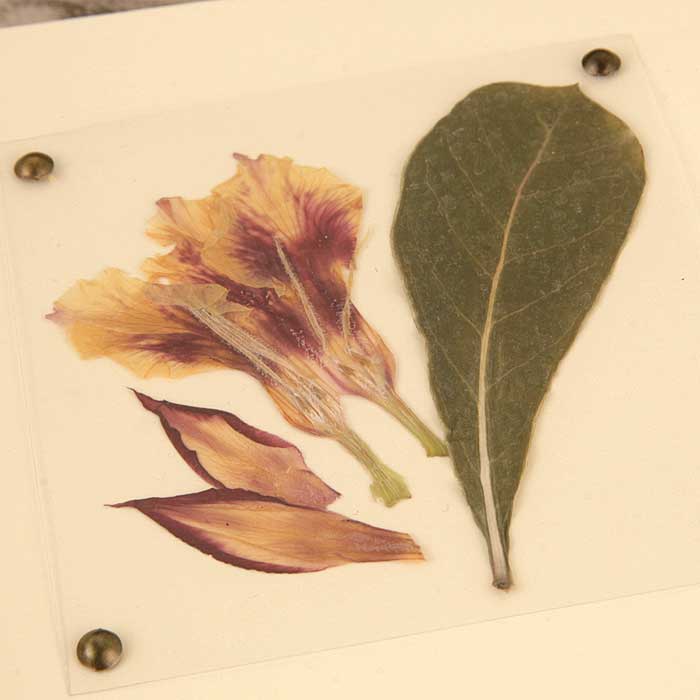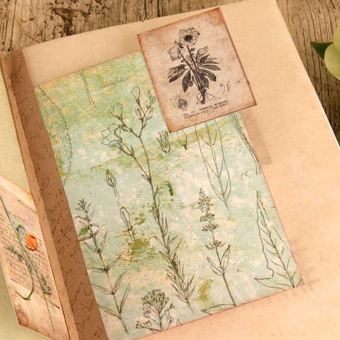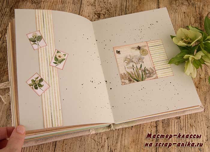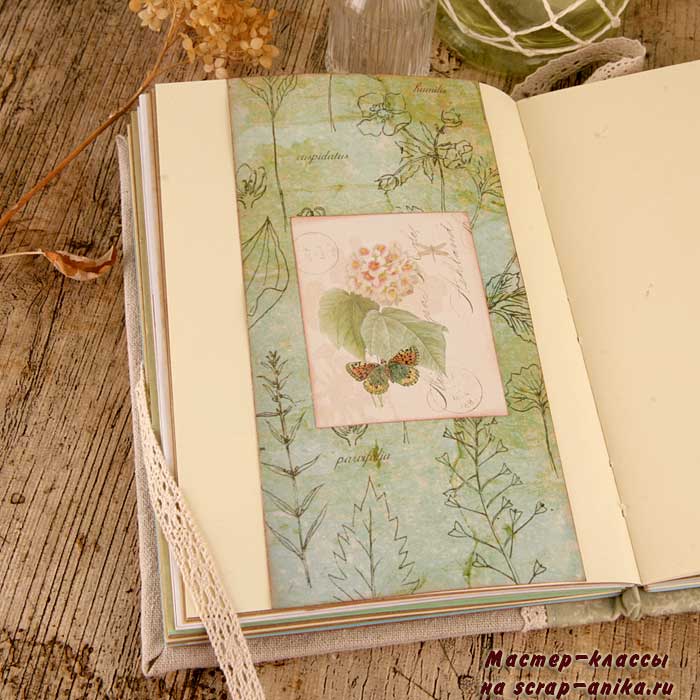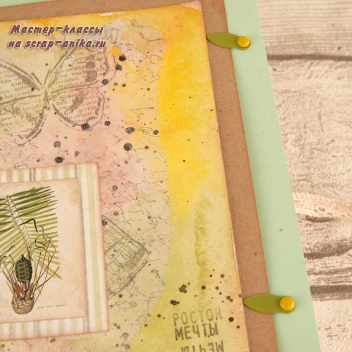 Какой же артбук в ботаническом стиле без гербария? Интересное решение - убрать его под плёнку, а саму плёнку закрепить по углам четырьмя брадсами. И, конечно, небольшой коллаж из красивой бумаги :)