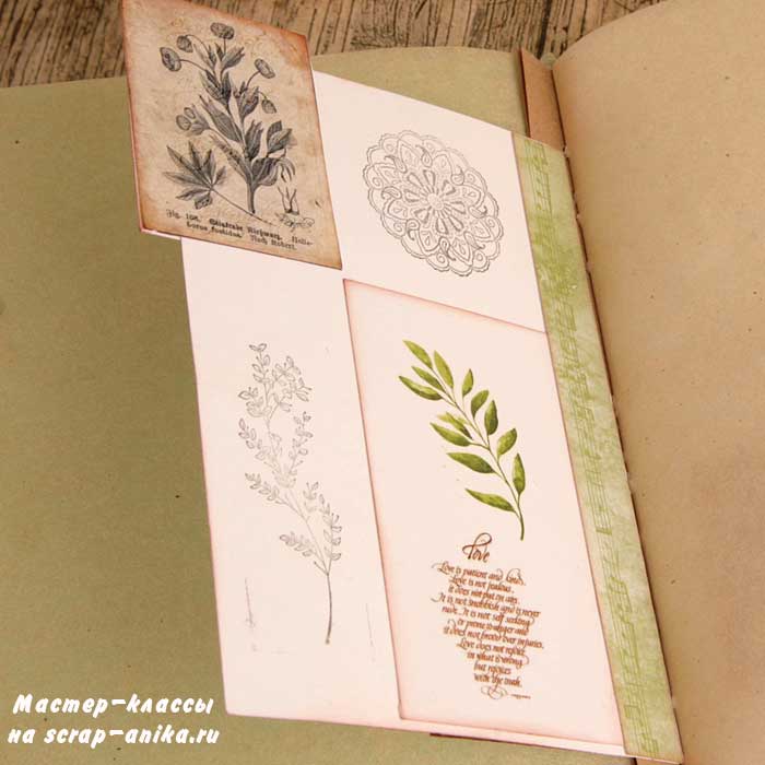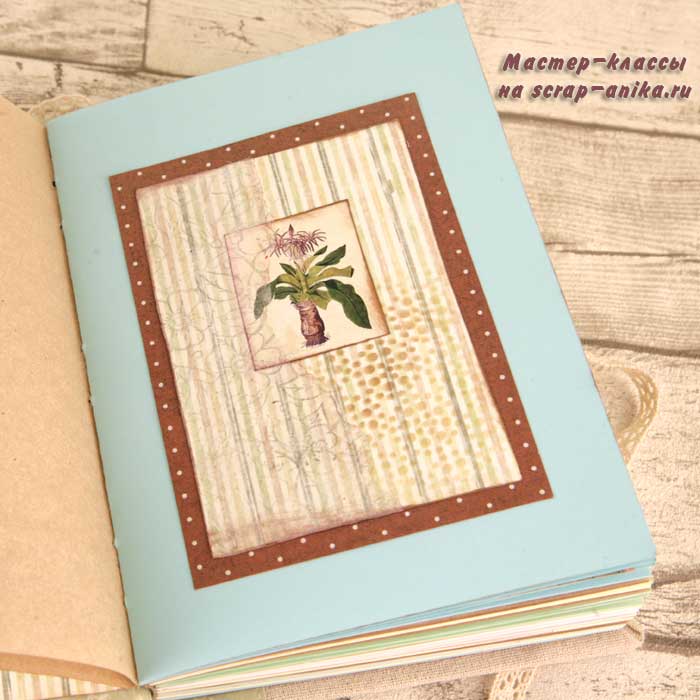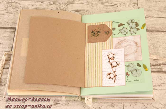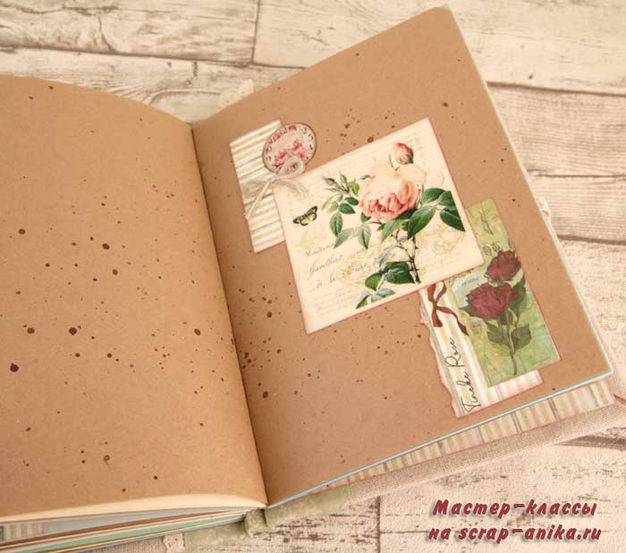 Еще одна анкерная страница. Вы уже видели ее изготовление в мастер-классе. Наклеила я ее на подложку с клапаном из крафт-бумаги.