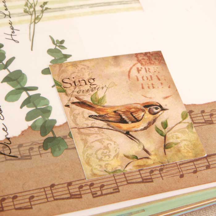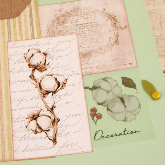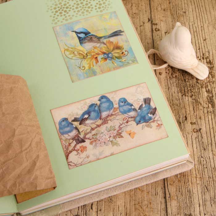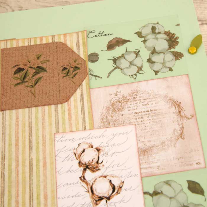 Очень интересно, когда на страницах используются разные материалы. На следующей странице, помимо бумаги, в коллаж вошли кусочек ткани с рисунком и джутовая сетка.