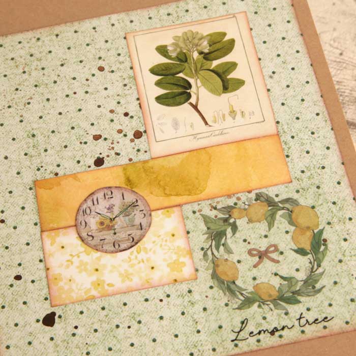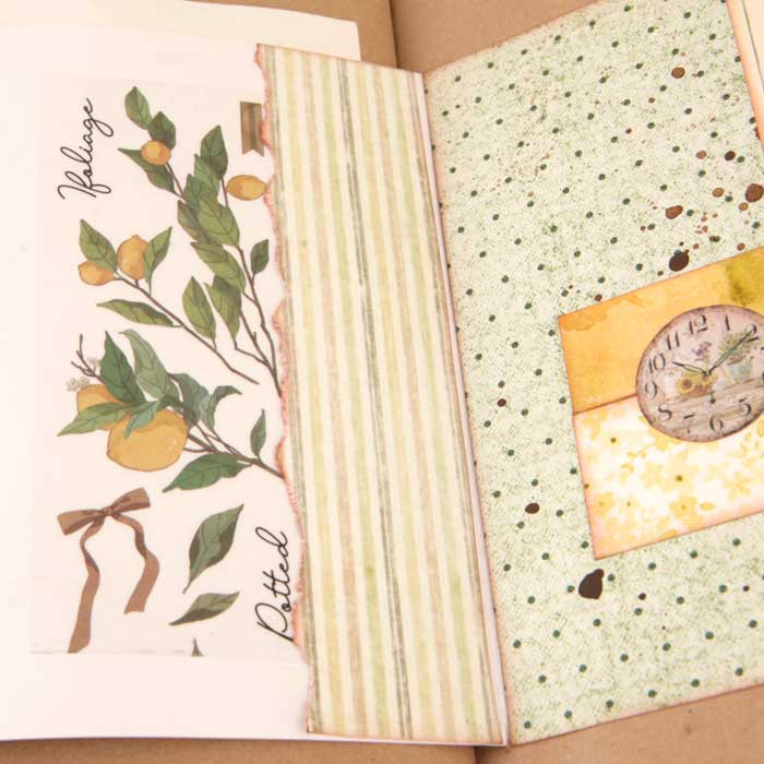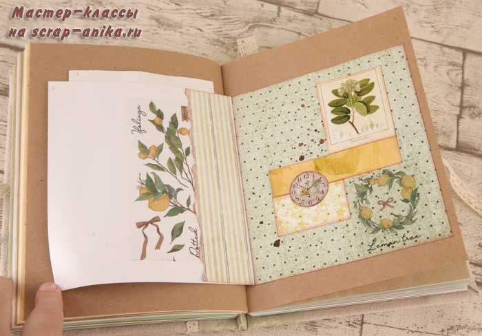 При открытии - коллажный разворот из бумаги и наклеек на прозрачной основе. На этот раз - тема лимонов.