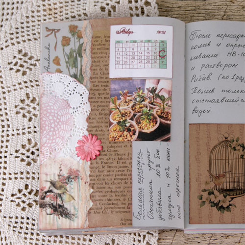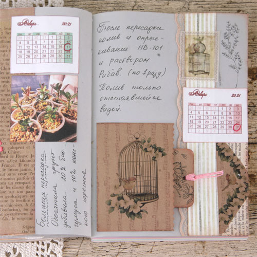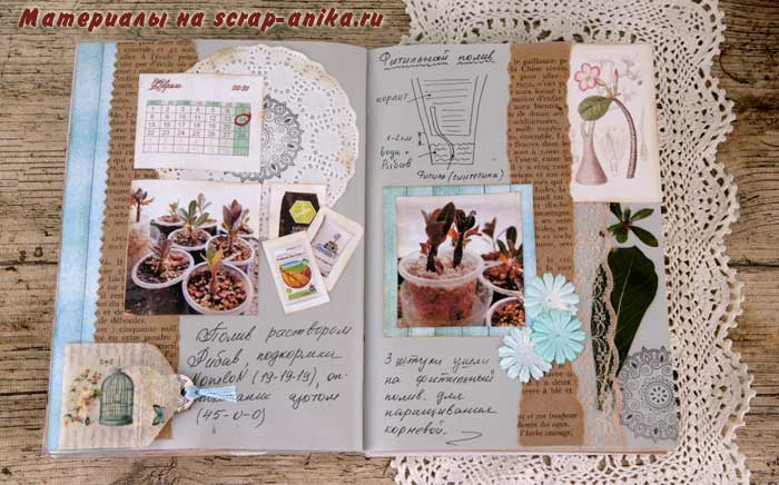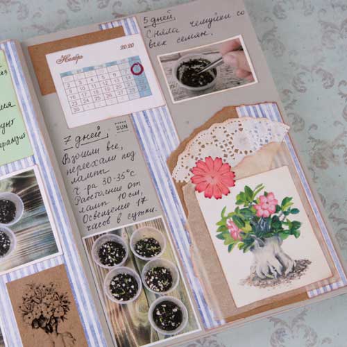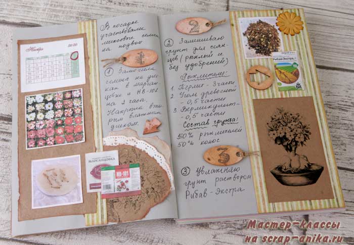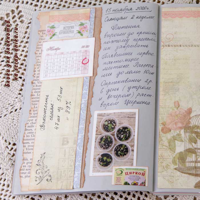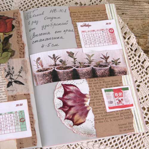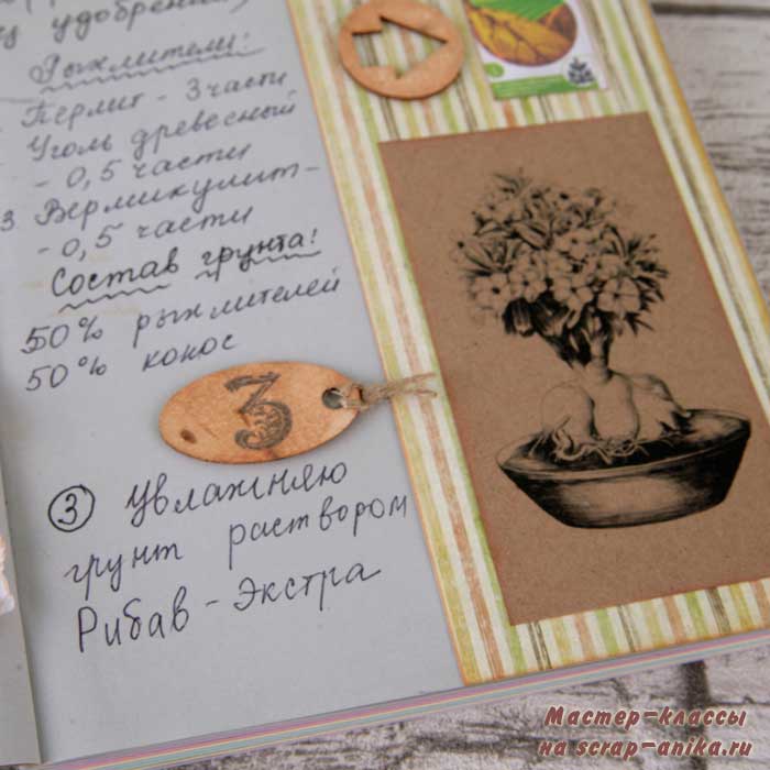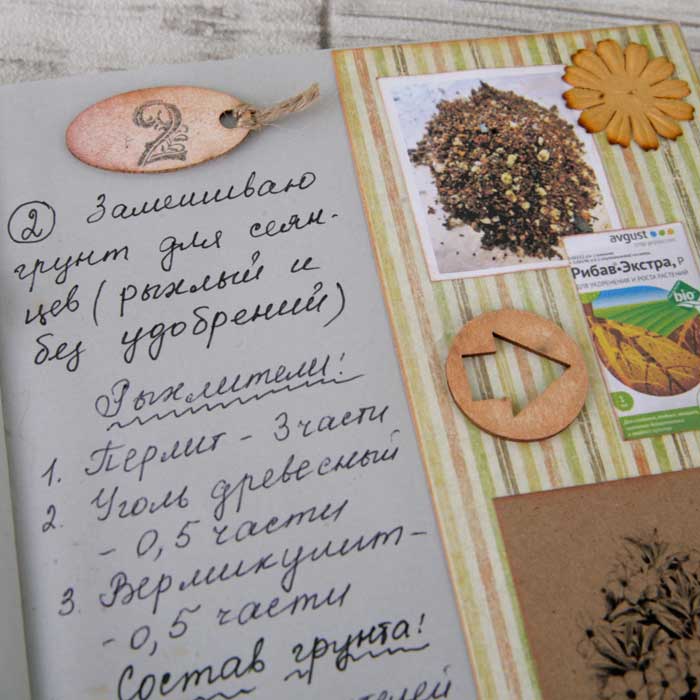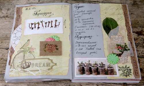 Следующий разворот я планировала сделать в спокойных зеленых оттенках, но изображение желтого пакета с удобрением заставил ввести дополнительный желтый цвет.