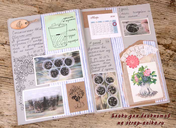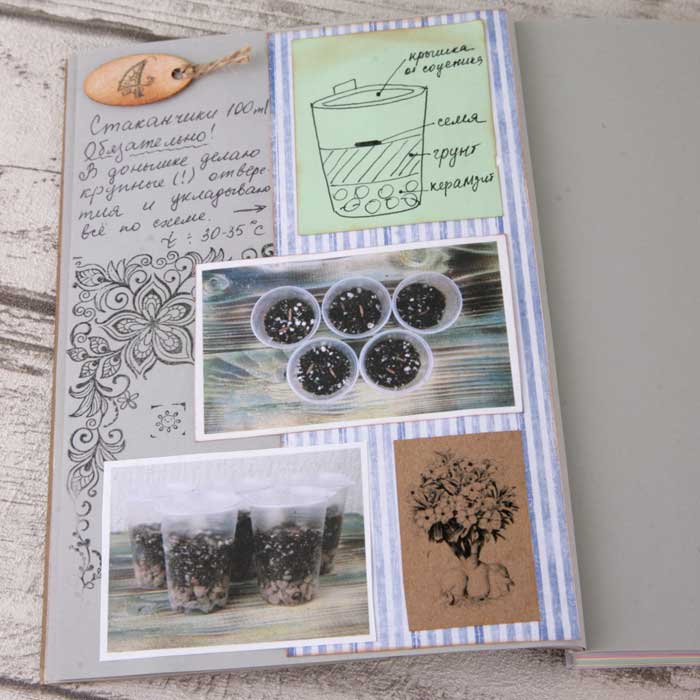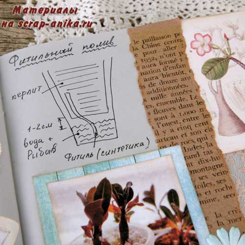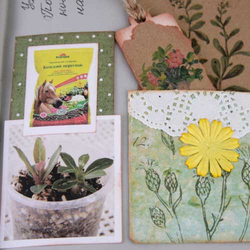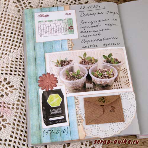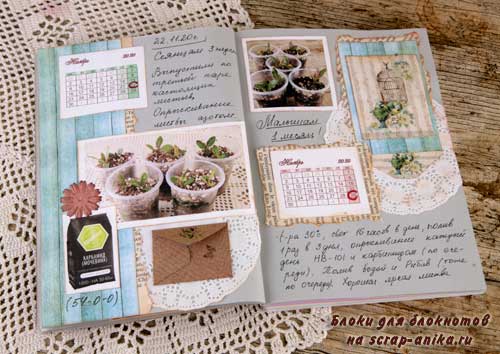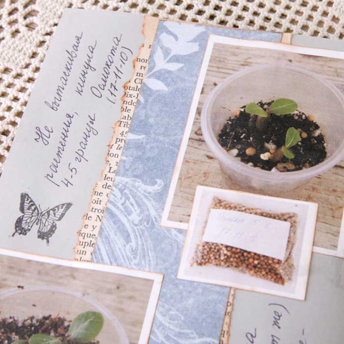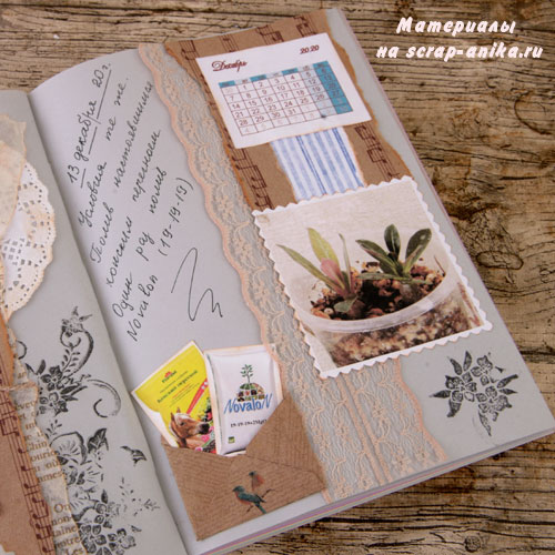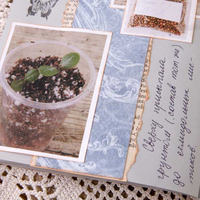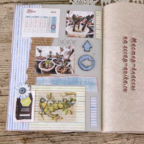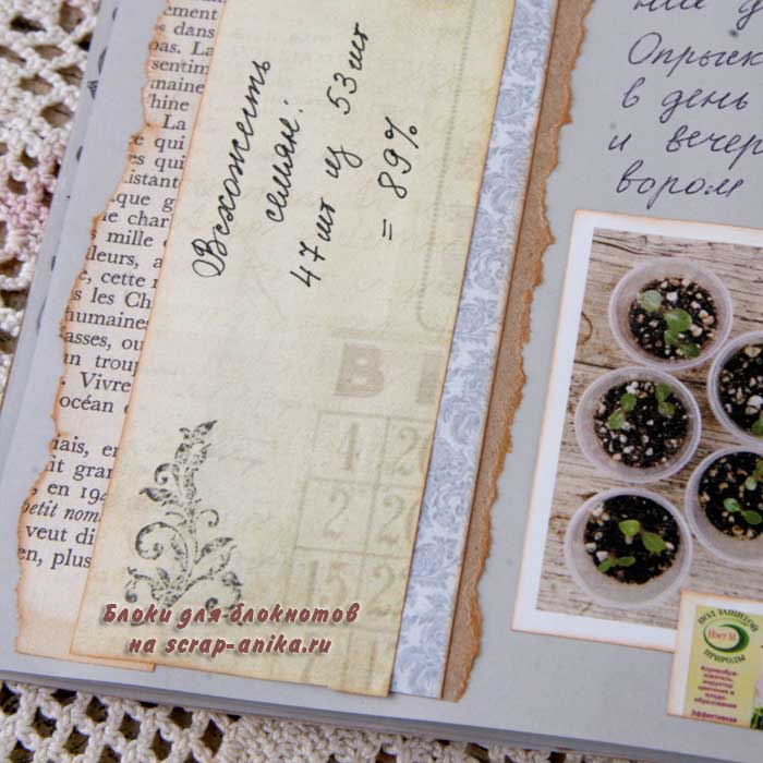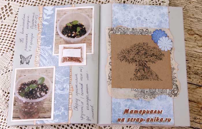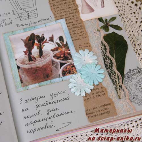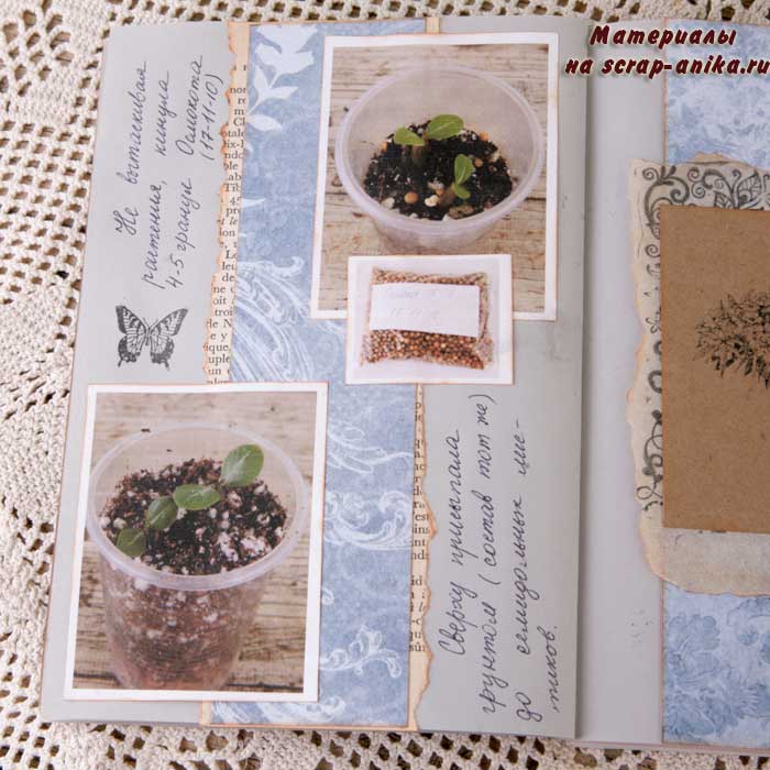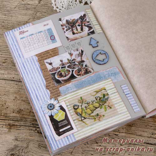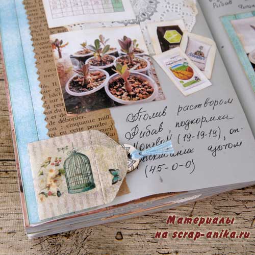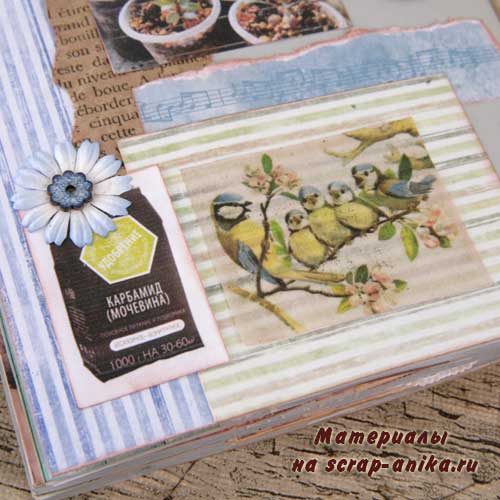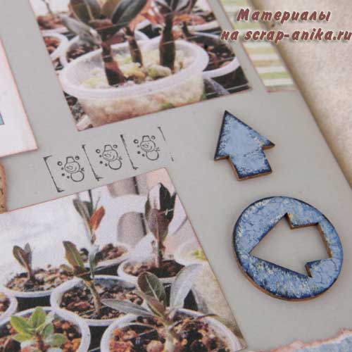 Так как я не хотела вводить желтый цвет в палитру разворота, то "желтое" удобрение "приглушила" голубым пакетиком.