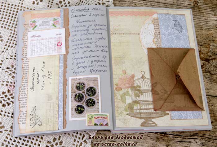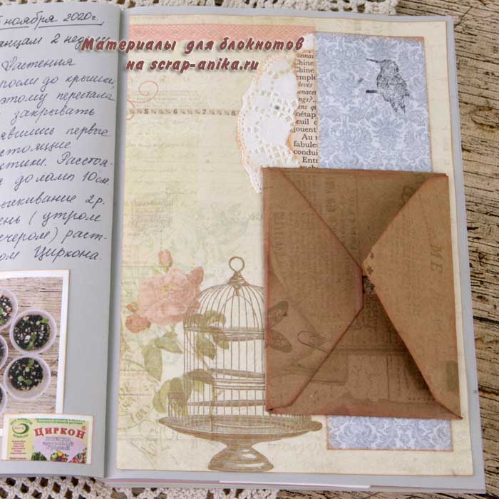 На второй странице разворота использовала средний конвертик из пергамента (конверт 5_2). Приклеила его лицевой стороной наружу. Я хотела его использовать как кармашек, поэтому срезала клапан. Кстати, клапан я тоже использовала в работе (посмотрите- он приклеен чуть ниже :)