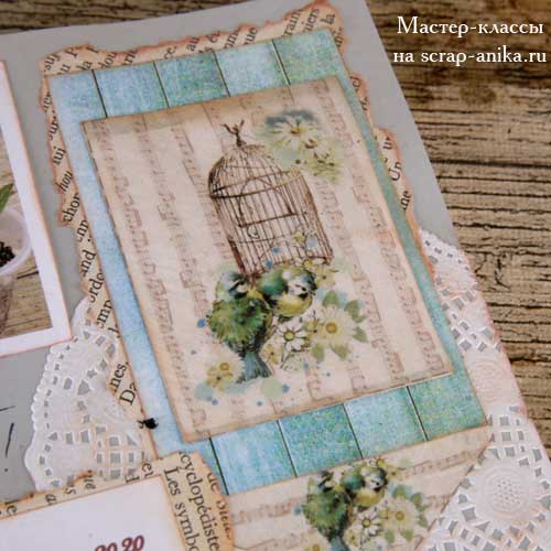На следующий разворот меня вдохновила бумага с птичками и нотами.