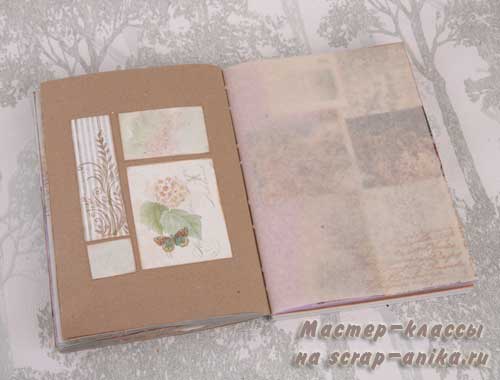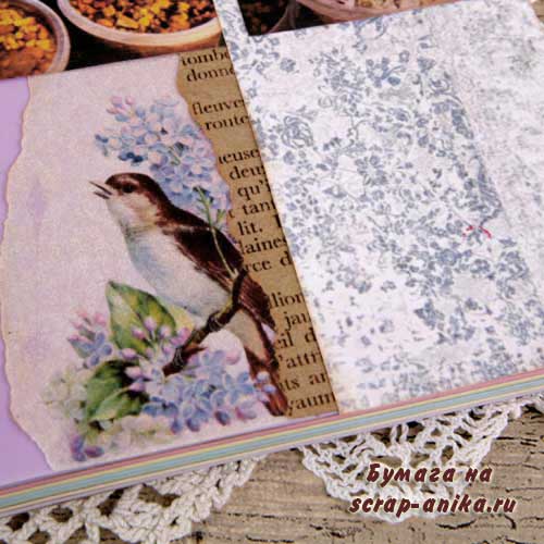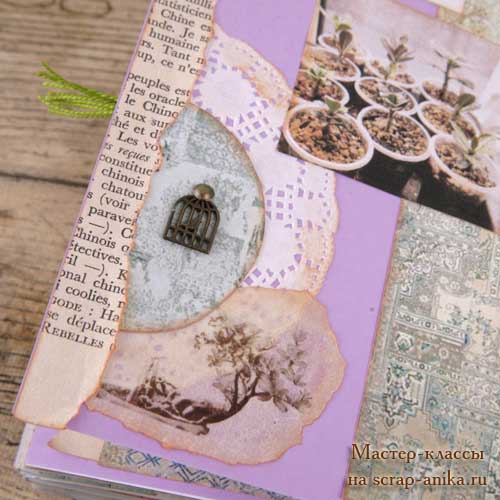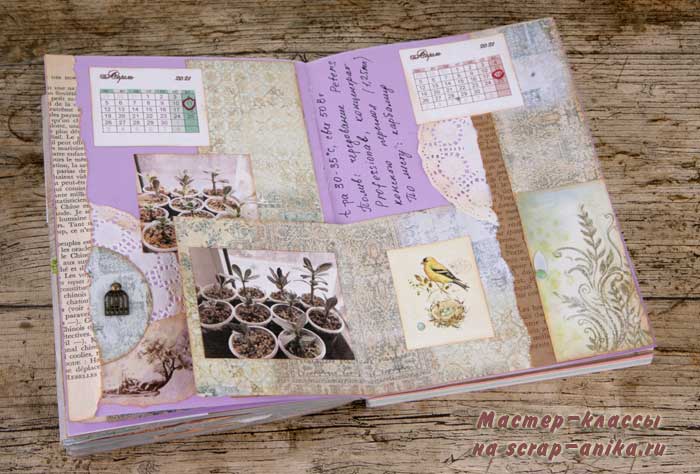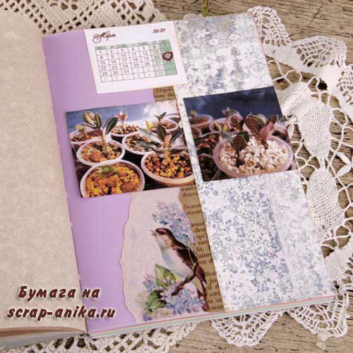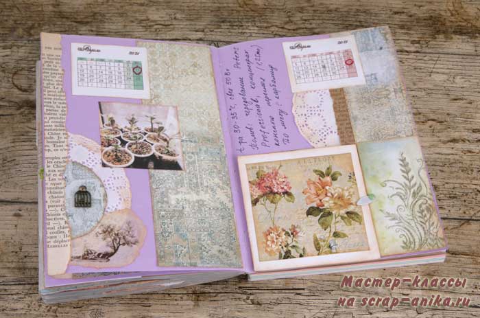 Оформление информационных страниц. Сложность на этот раз в ярко-сиреневом цвете этой тетради. Пришлось подбирать бумагу так, чтобы этот цвет немного приглушить.