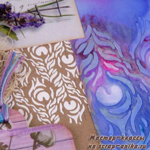 Обратите внимание - мотив из белой текстурной пасты есть и в оформлении активной страницы. Он чудесно перекликается темой перышек с цветным элементом и белым цветом с элементом на другой страничке разворота. Этим хороши трафареты, которые идут комплектом.