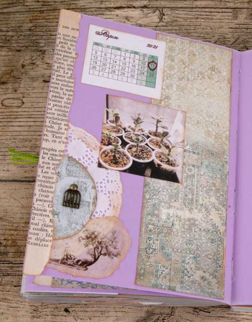 Последний разворот разделителя выполнен в стиле коллаж. Использованы кусочки акварельного фона, рисунок-картинка в тех же тонах (коллекция 37_10) и штампинг на бумаге (коллекция 38_4).
