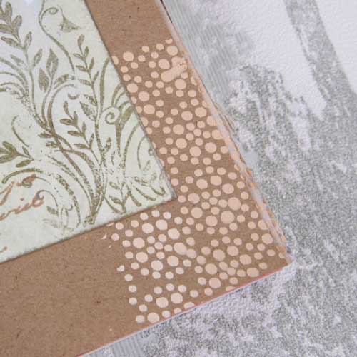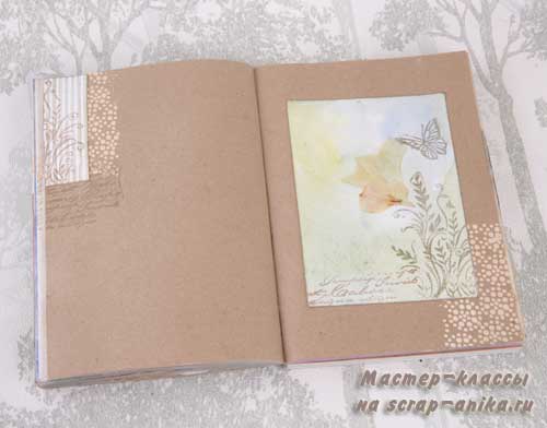 Вторая половина от заготовки пошла на второй разворот. Он выполнен на двух листах из крафт-бумаги. Поэтому, при очень активном первом листе, на второй лист я нанесла совсем небольшую деталь с помощью текстурной пасты и того же трафарета.