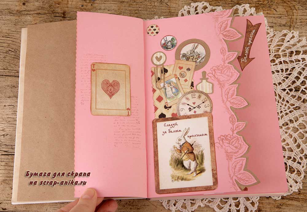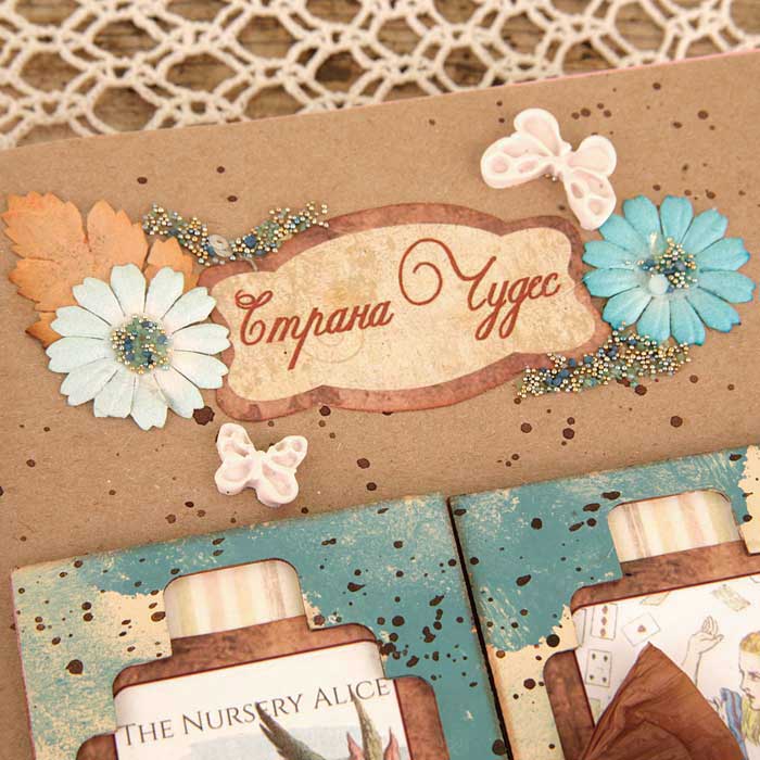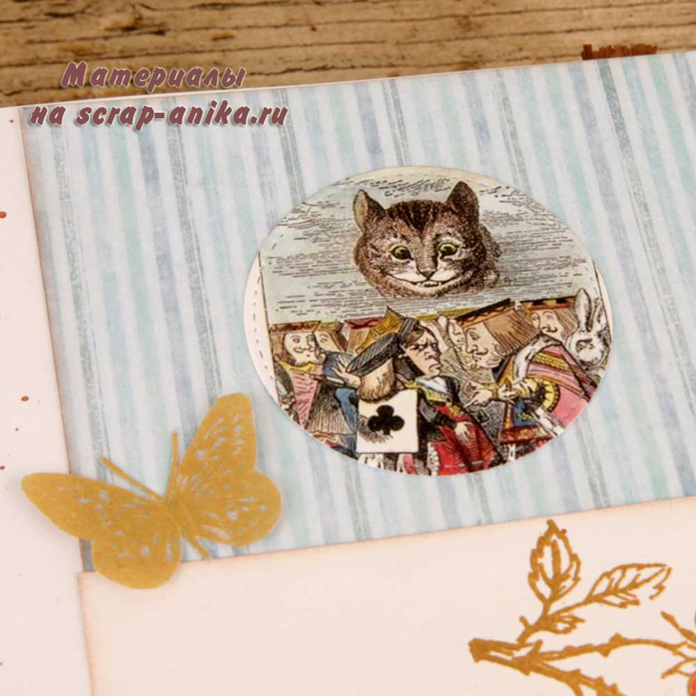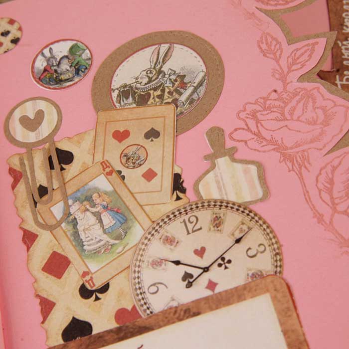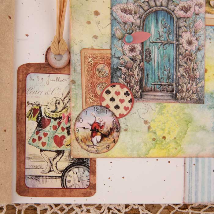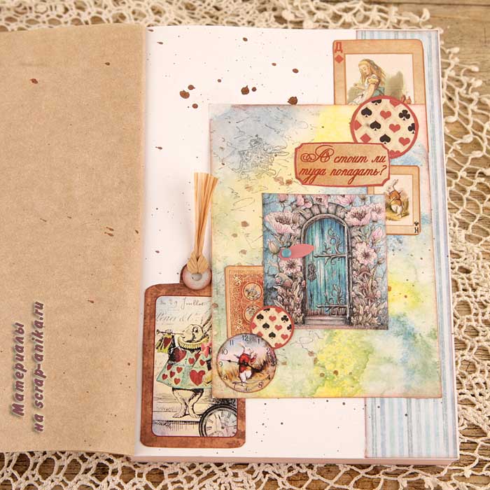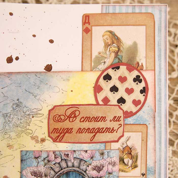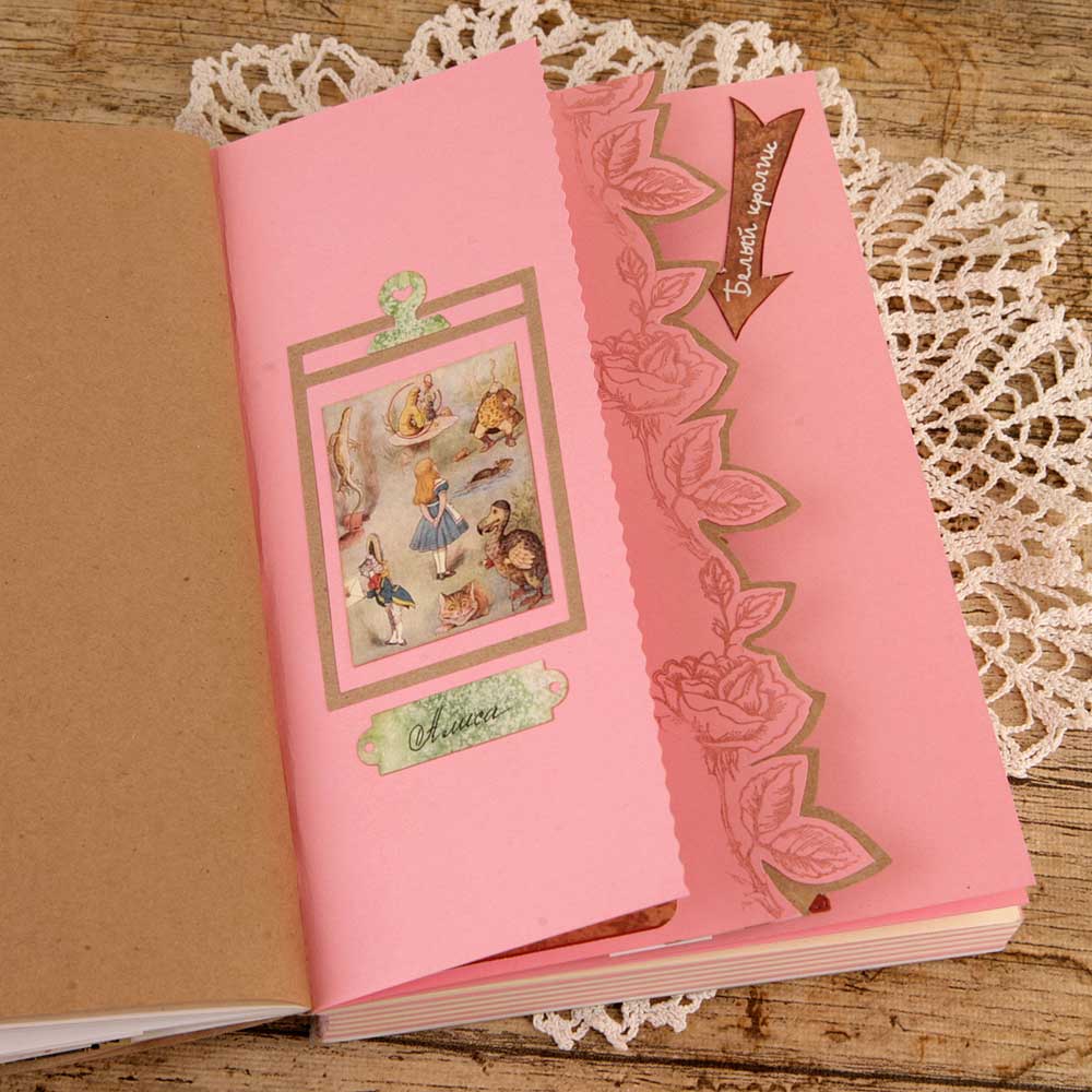 Второй разворот из каскада - красивый бордюр с подложкой из крафт-бумаги. В работу пошло многое - вырубка, фишки, штампы из коллекции по Алисе.