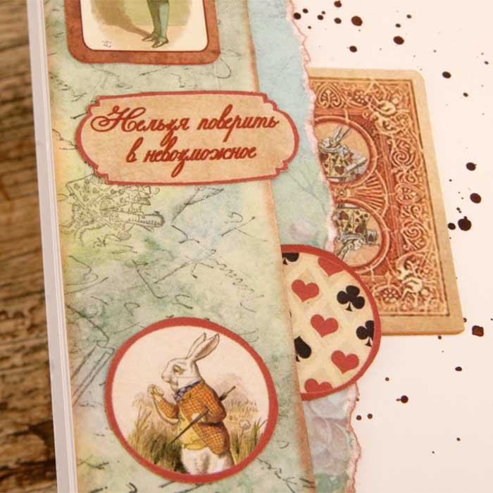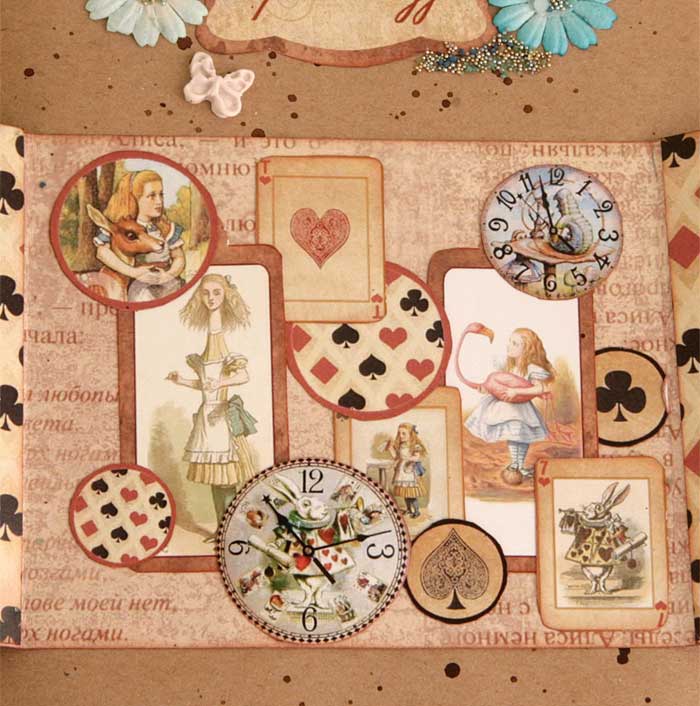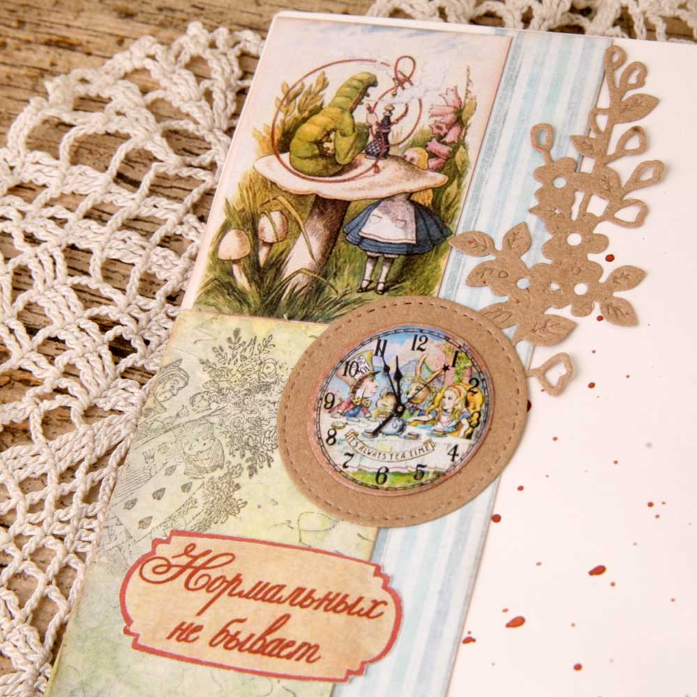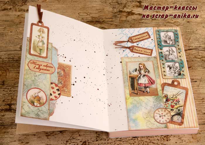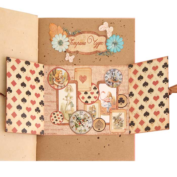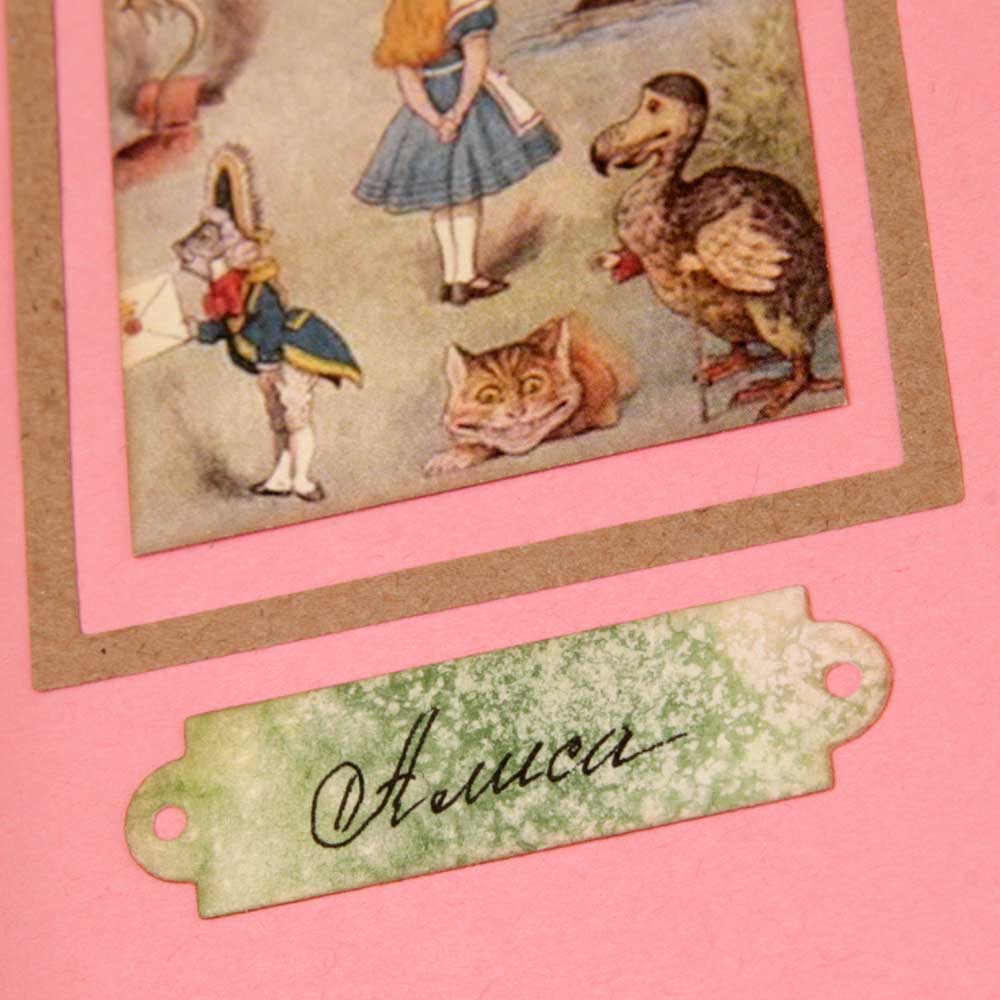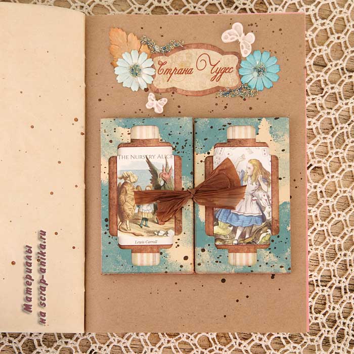 Второй разворот из каскада - красивый бордюр с подложкой из крафт-бумаги. В работу пошло многое - вырубка, фишки, штампы из коллекции по Алисе.