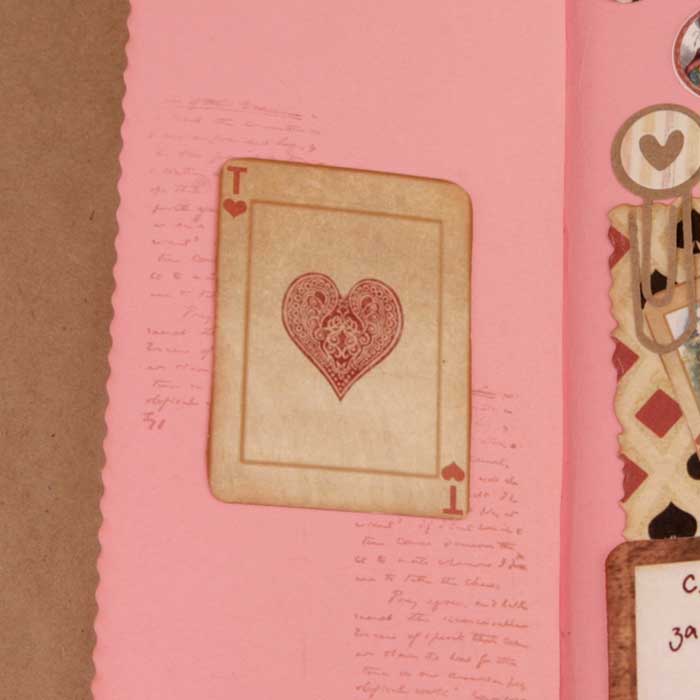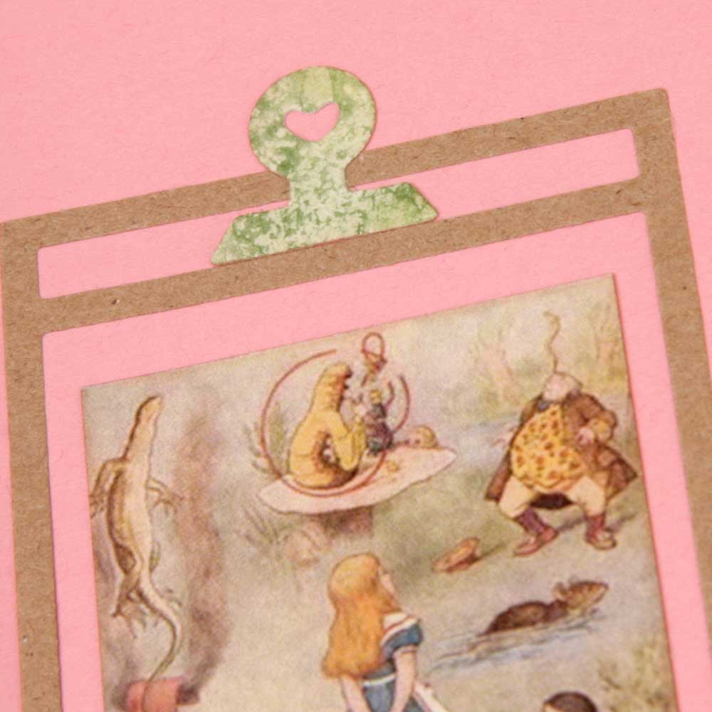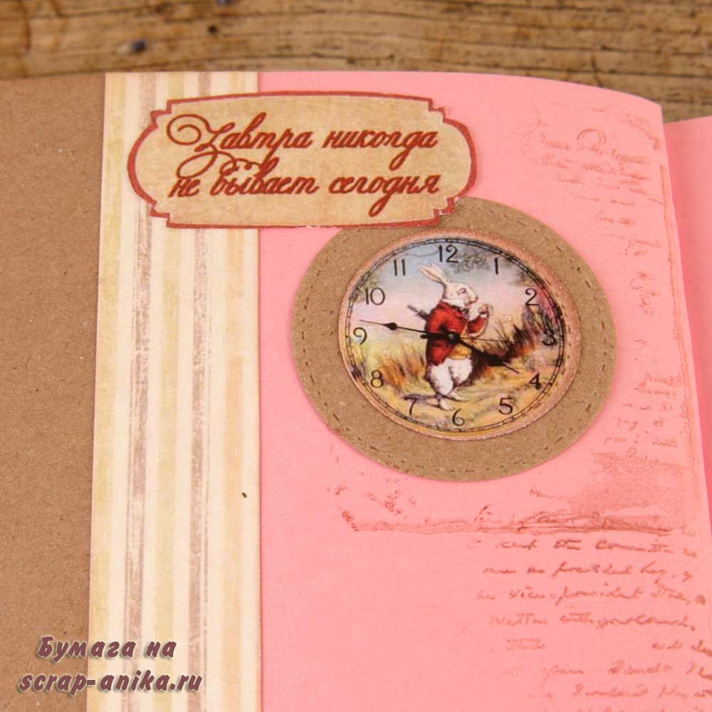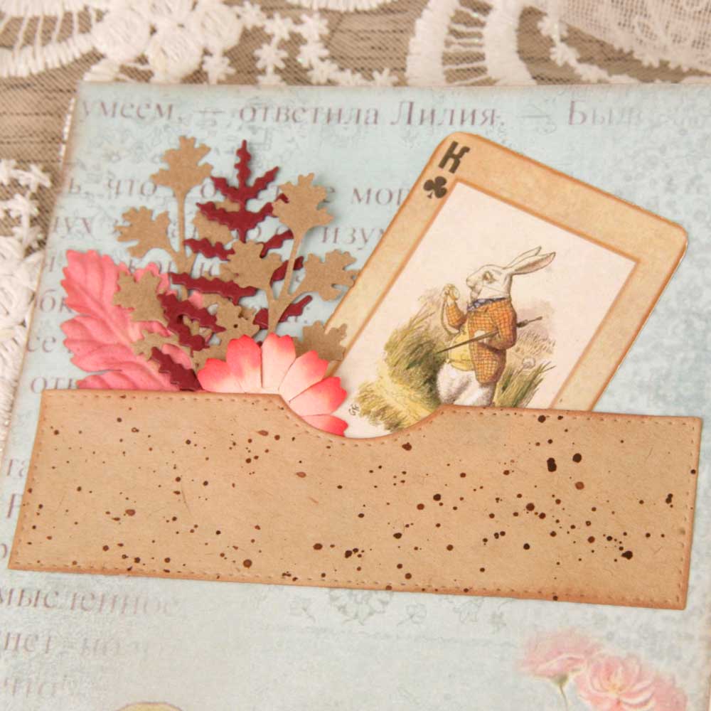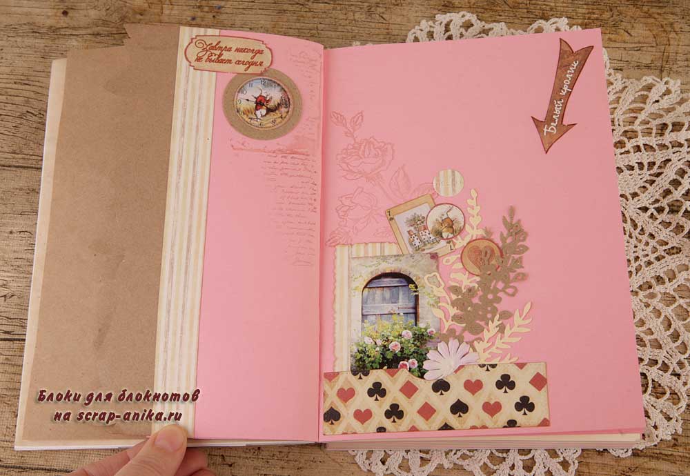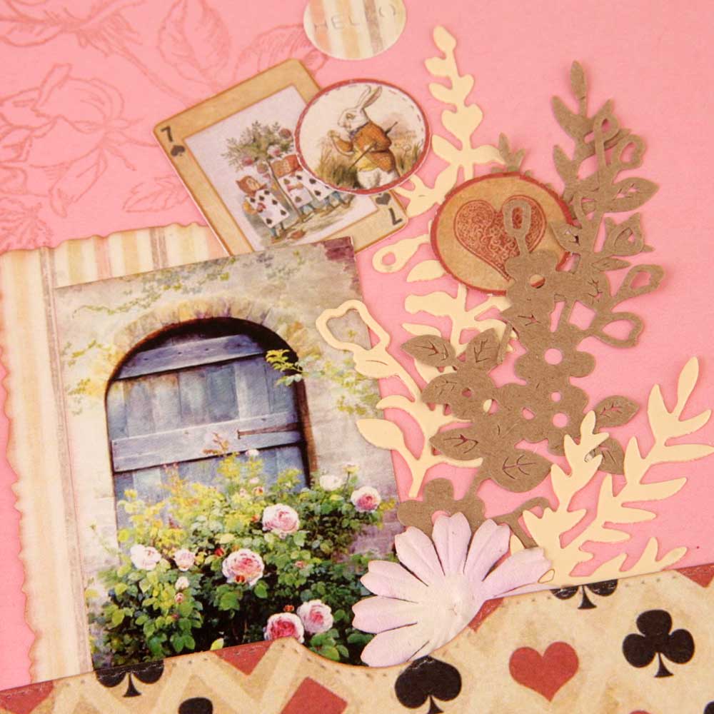 Второй разворот из каскада - красивый бордюр с подложкой из крафт-бумаги. В работу пошло многое - вырубка, фишки, штампы из коллекции по Алисе.