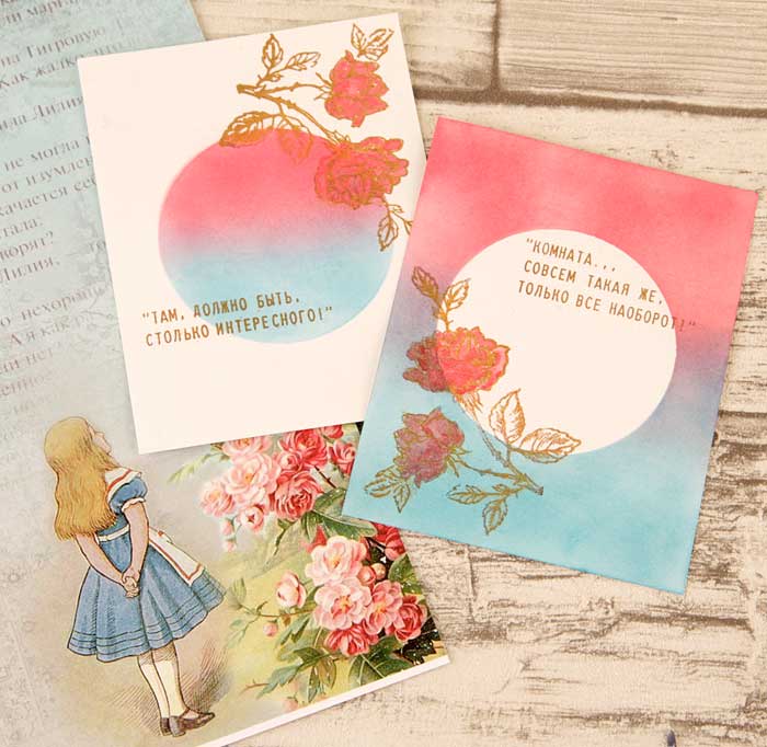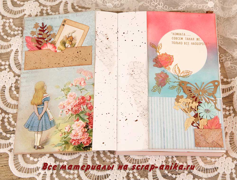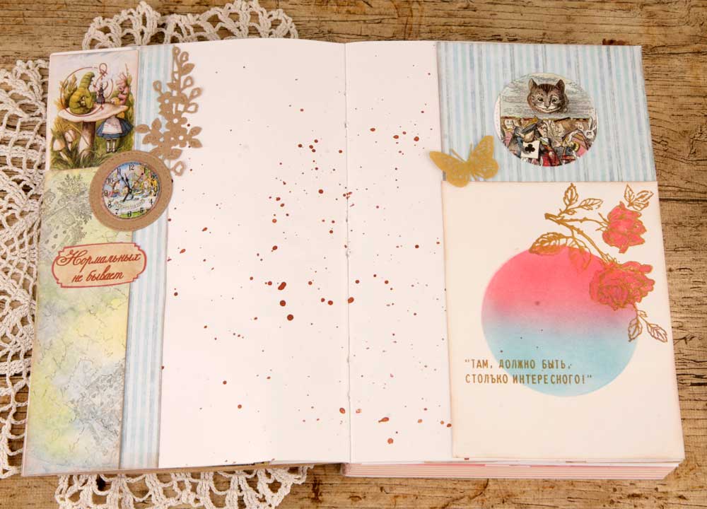 Для следующих двух разворотов были сделаны две инверсные заготовки - чем не идея Алисы в Зазеркалье. Надписи - цитаты из книги.