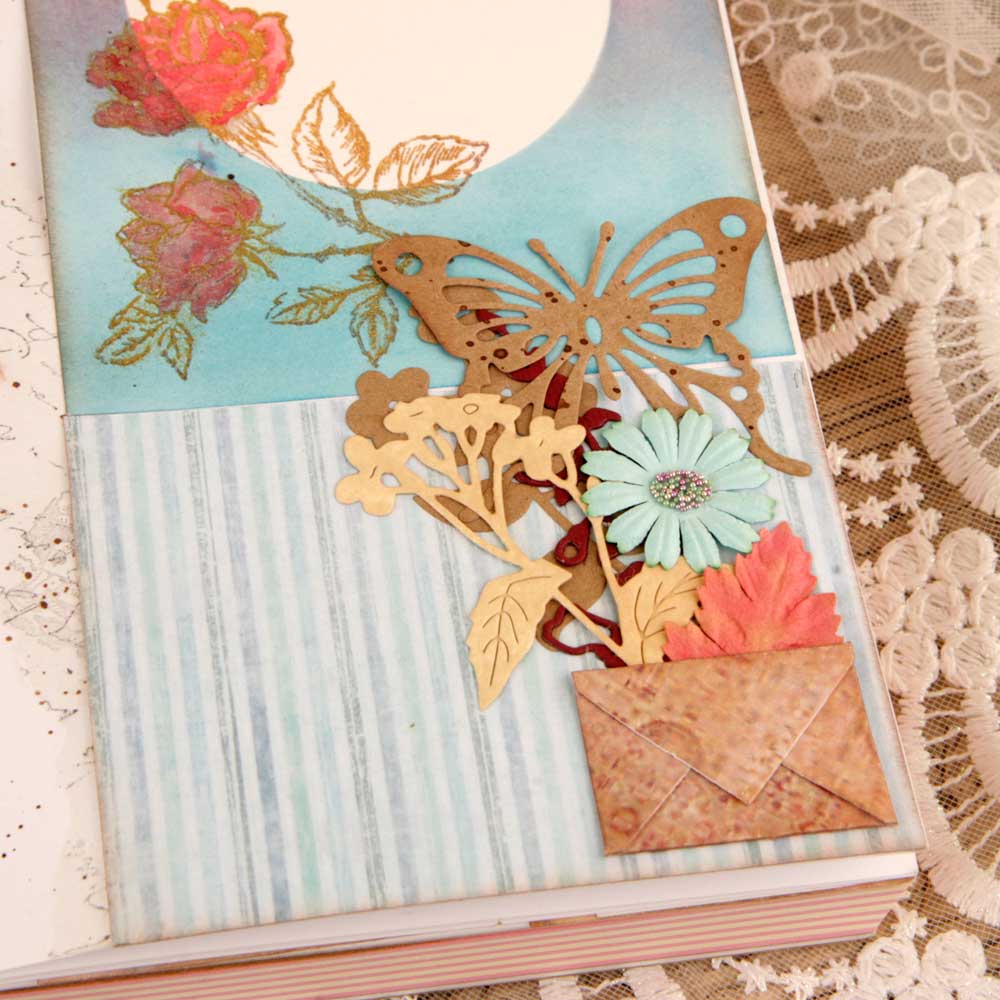 На самом деле, у меня получился каскад из 3-х разворотов. Когда делала бордюр, плохо пропечатался штамп и пришлось обрезать край (в скрапе брака не бывает). Так появился верхний лист. На втором листе бордюр уже был отпечатан и обрезан как надо. Казалось бы - недоразумение, но оно привело к интересному решению и я его буду использовать в своих артбуках в дальнейшем :)