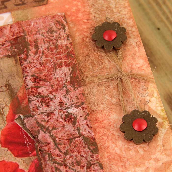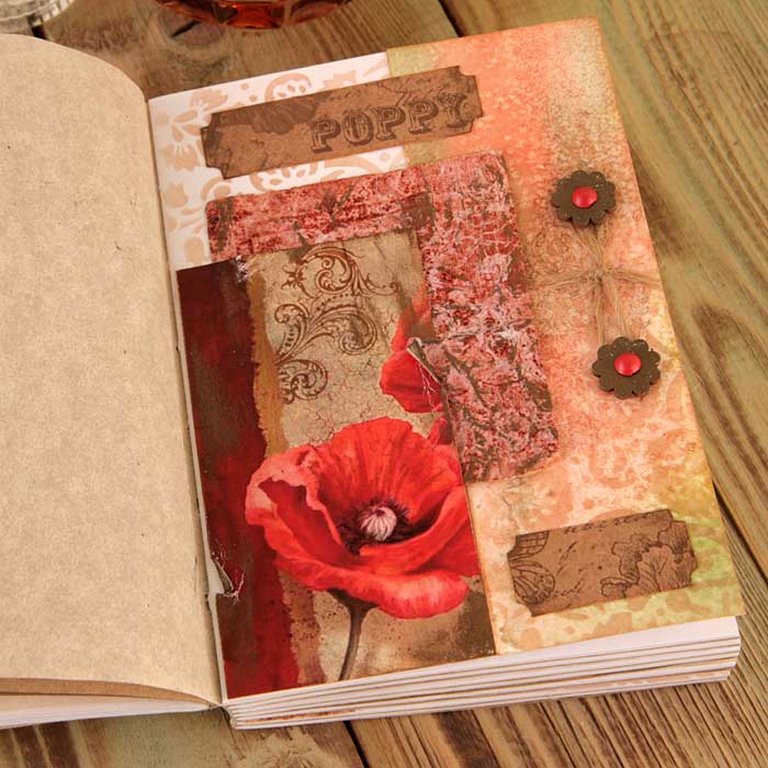 Из интересных элементов на этой страничке - джутовая связка между двух чипбордов-цветочков, закрепленных брадсами. Кстати, чипборды тоже тонированы воском. Эти цветочки Вы увидите на всех страничках блокнота.