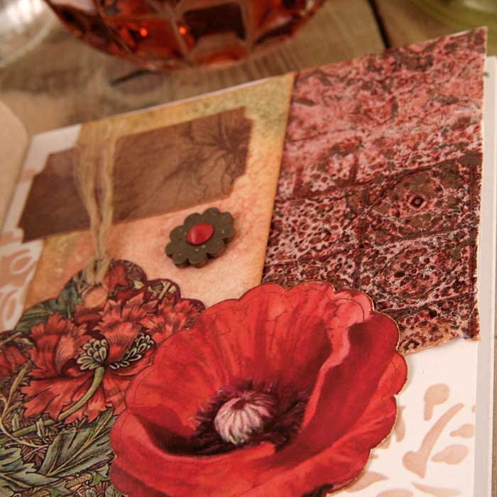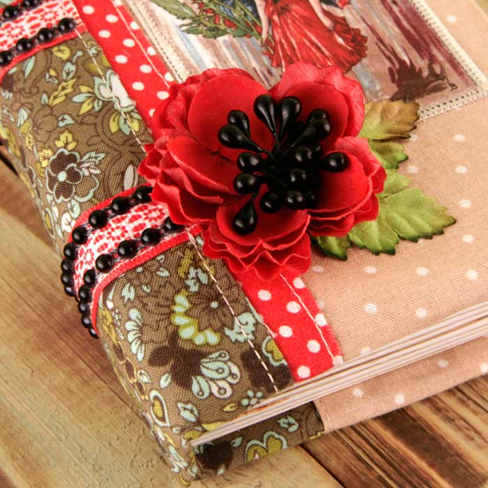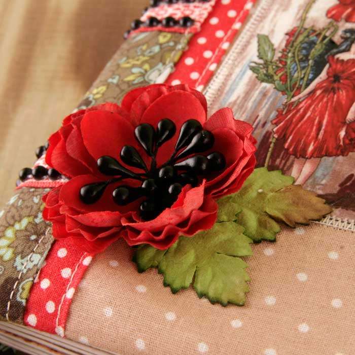 Хотелось непременно большой тканевый мак на неё. Вариант нашелся очень быстро. Я взяла тканевые цветы, вытащила сердцевину и вставила черные тычинки.