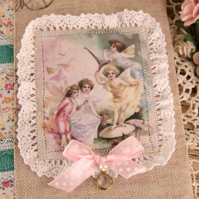 Обложка немудреная - картинка в кружеве-резинке, ленточка в горошек и подвесочка.