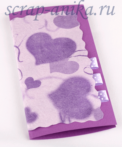 4. Сверху на обложку наклеила бумагу с сердечками так, чтобы с края выступали ленточки. Бумагу прихватила клеем только по углам.