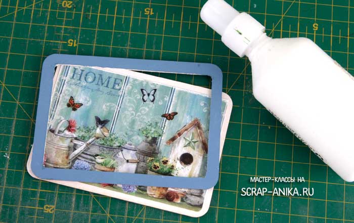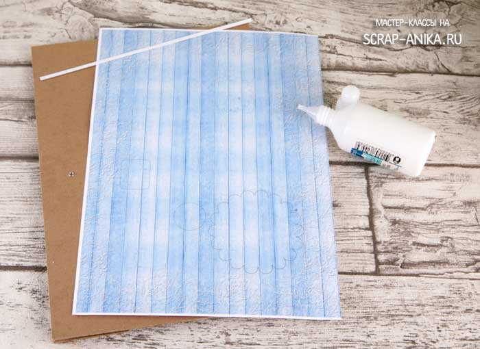 2. Фоновый лист обрезаем по формату рамки и приклеиваем к основе. Рекомендую клей перелить в пластиковую бутылочку с тонким носиком.
