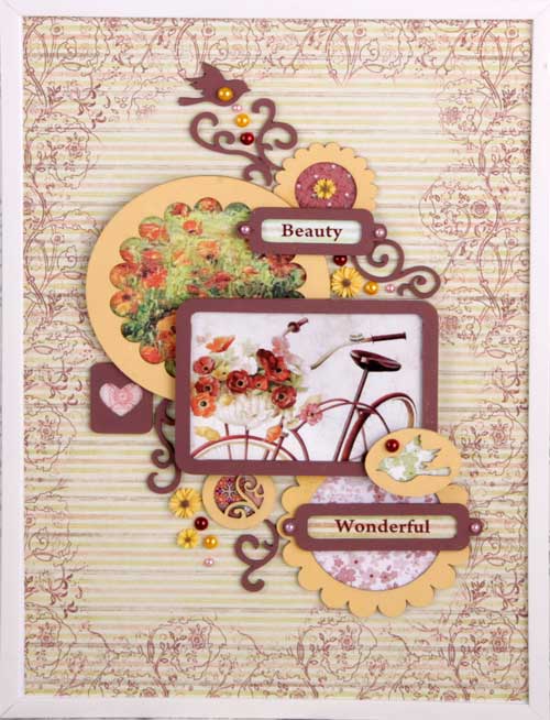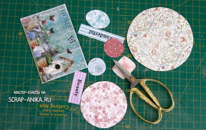 6. Скрапбукинг - это всегда многослойность. Одни детали должны перекрывать другие. Третьи детали должны давать простор воображению. Поверх двух маленьких элементов вклеиваем большой круг.