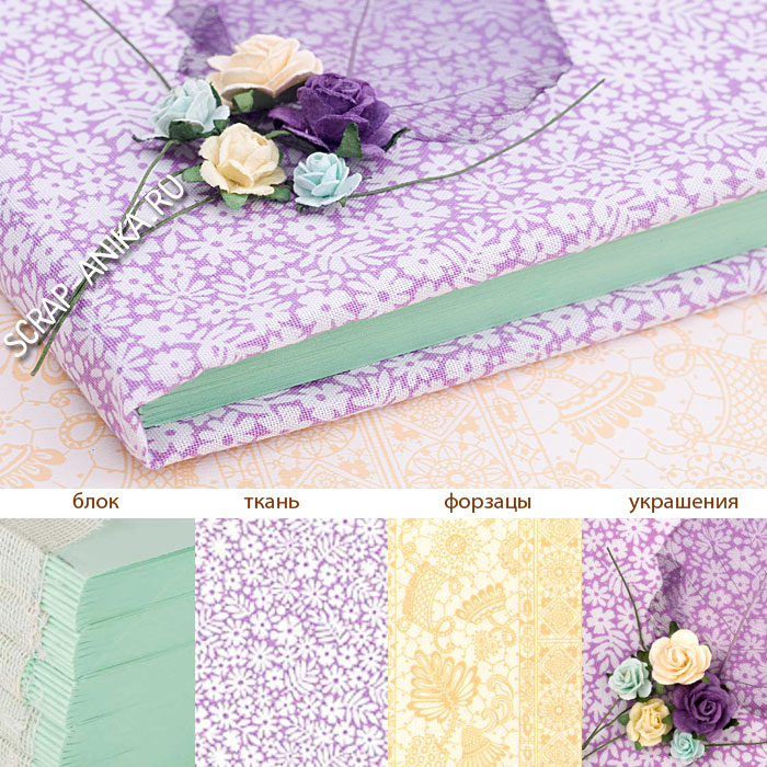 Ткань нежно-фиолетовая в белый цветочек. Можно сочетать с ярко-розовым блоком, с нежно-желтым, с лиловым и лиловым в розовую полоску. Я решила предложить Вам сочетание с зеленым блоком. И ввела дополнительный светло-желтый цвет в форзацы.