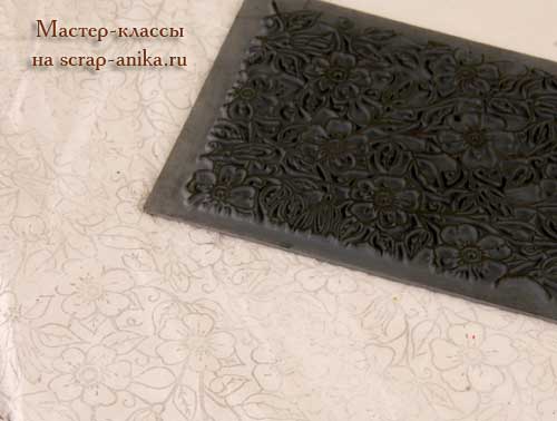 А теперь добавим на нашу бумагу "вуаль" с помощью наших отштамповок на бумаге тишью.