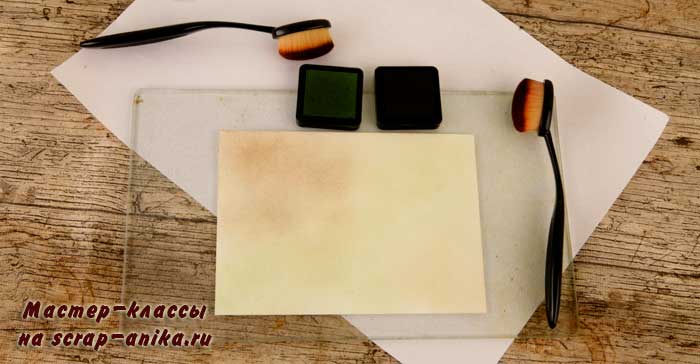 Для работы нам понадобятся косметические щеточки или спонжики и штемпельные чернила. Тонировку удобно проводить на стекле. Начинаем тонировать за фоном, чтобы не было начального мазка и потихоньку заводим на бумагу. Так можно получить красивый ровный фон с переходом цвета. Интенсивность фона зависит от яркости и свежести чернильной подушки.