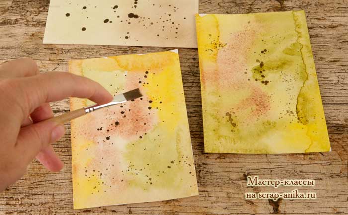 Добавляю на фоны несколько художественных капель. Для этого на плоскую кисточку набираю краску, разведенную водой и, постукивая по ней, получаю брызги.
