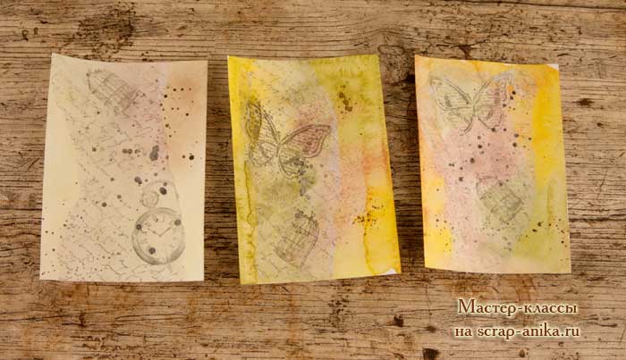 Как делать акварельный фон, мы уже рассматривали в предыдущем мастер-классе. Я сделала несколько заготовок акварелью по сырому.