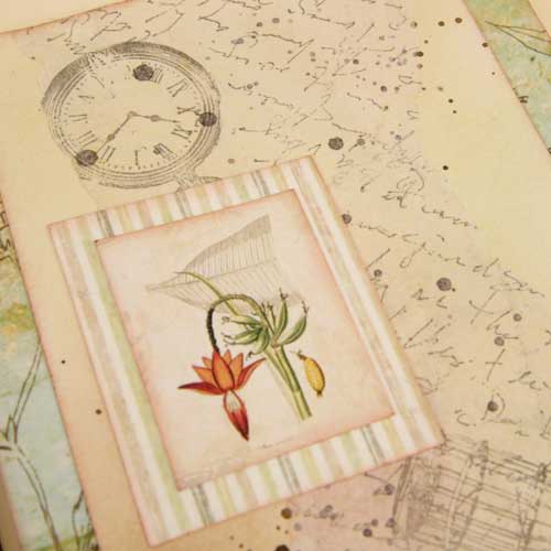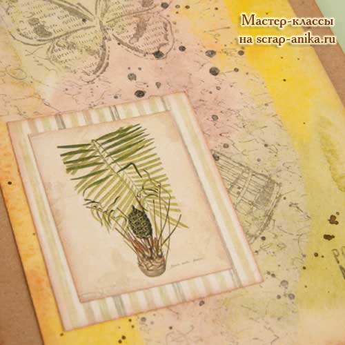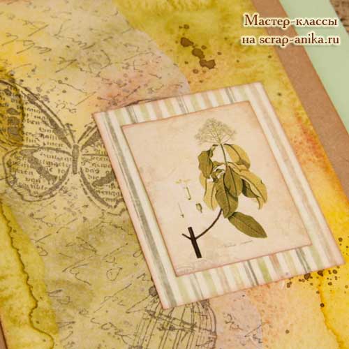 Здесь всё просто - важно выбрать бумагу, которая не будет активной и на которой будут хорошо выделяться наши штампы. Я выбрала полосочки из коллекции 31_10. Картинка - мотив с листа коллекции 47_4. Прежде чем приклеить картинку, я нанесла на фон штемпельные чернила через трафарет № 22_1. Наношу клей на бумагу тишью с изнаночной стороны и приклеиваю на место. Бумага быстро промокает, поэтому нужно делать всё быстро. Пройдитесь по рваному краю сверху кистью с клеем, чтобы при высыхании края не поднимались. Обратите внимание - она проходит как вуаль и по фоновой бумаге, и по картинке, создавая любимую многослойность. Итог подсушила феном.