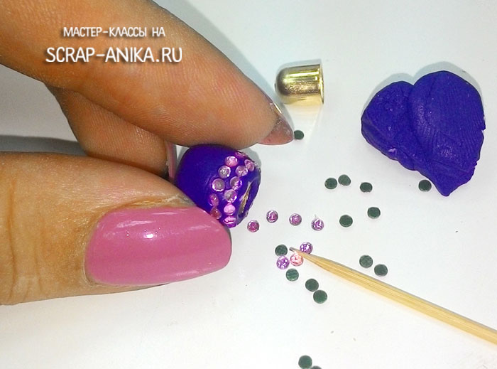 Коротко опишу: базовый концевик облепила маленьким кусочком полимерной глины, поверх выложила стразики. Запекла при температуре 120-130 градусов.