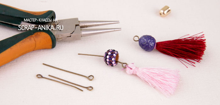 Так же можно использовать концевики с отверстием или глубокие шапочки для бусин. В этом случае надо зацепить кисточку и продеть штифт в отверстие. Сделать петельку.