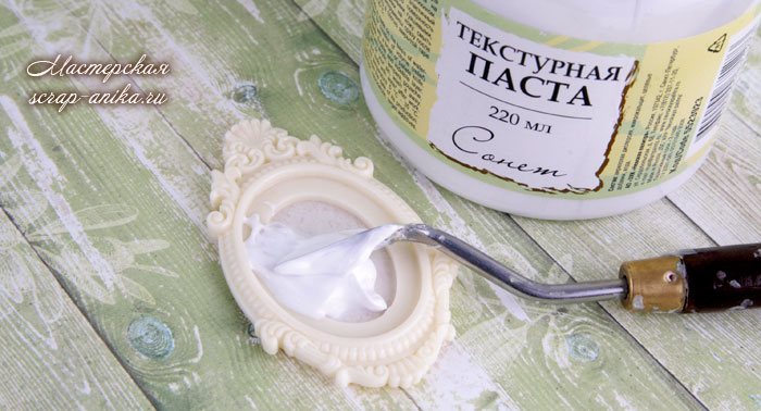 2. Мастихином наношу текстурную пасту рамки на всю внутреннюю поверхность. ВАЖНО! Всё нужно делать очень быстро, до схватывания текстурной пасты. Поэтому продумайте композицию заранее, подготовьте все детали, вытащите их из пакетиков.