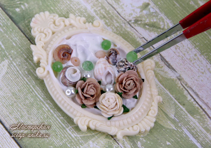 3. Выстраиваю из крупного декора картину, немного погружая детали в текстурную пасту.