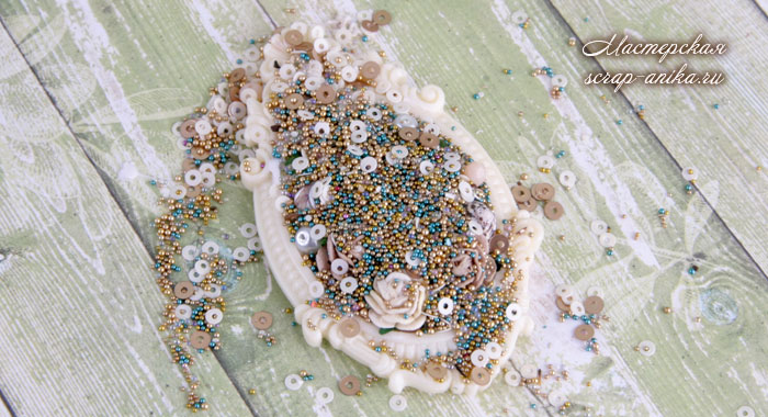 4. Посыпаю всё микробисером (смешиваю несколько цветов, добавляю пайетки). Оставляю до полного высыхания на часик-два. Крупные панно на всю ночь.