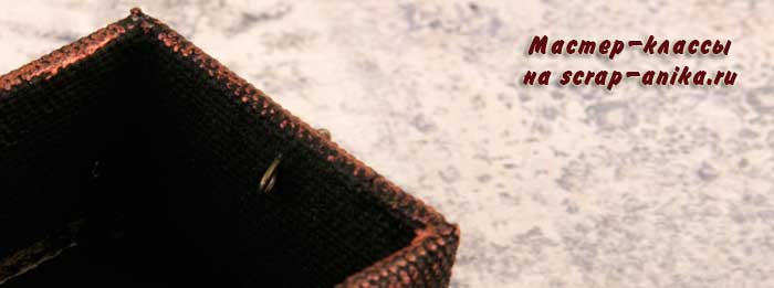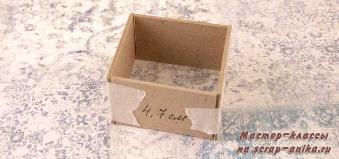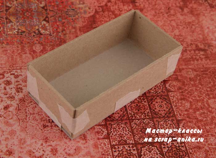 Накрываю боковушки коробочки донышком. Закрепляю его всё тем же строительным скотчем.
