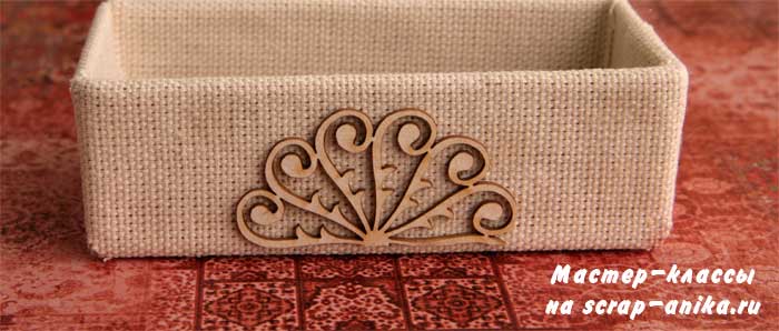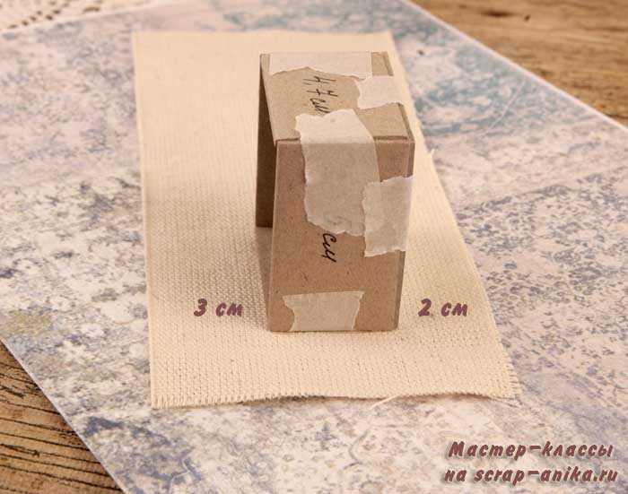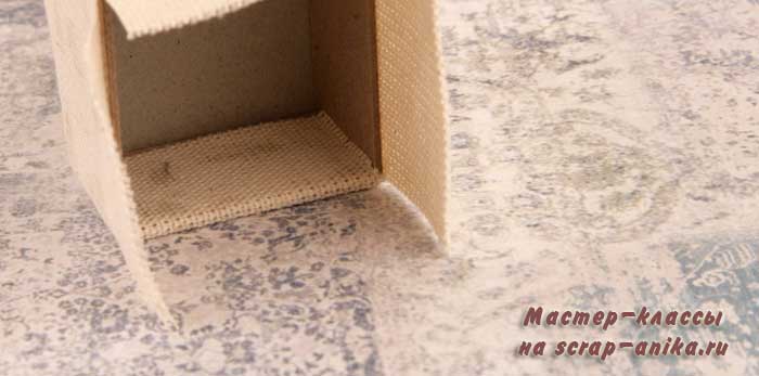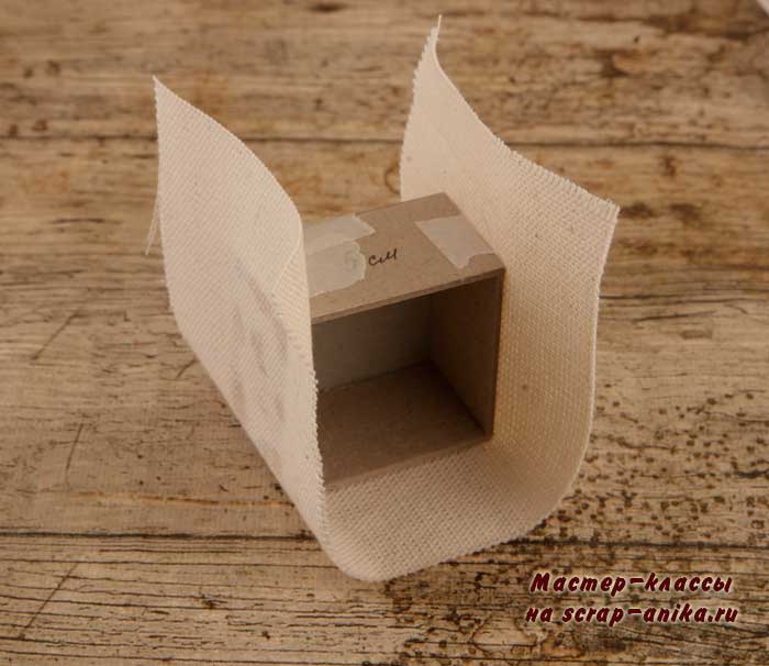 Смазываю клеем одну сторону ящика и ставлю ее на полосу из двунитки так, чтобы со стороны донышка было 2 см, а с открытой стороны 3 см. От края полосы отступите примерно 2,5 см - это будет у нас место совмещения. Выполняйте работы с клеем на листе бумаги - клей обязательно проступит через ткань и запачкает стол, если ничего не подложите. Клей использую полимерный.